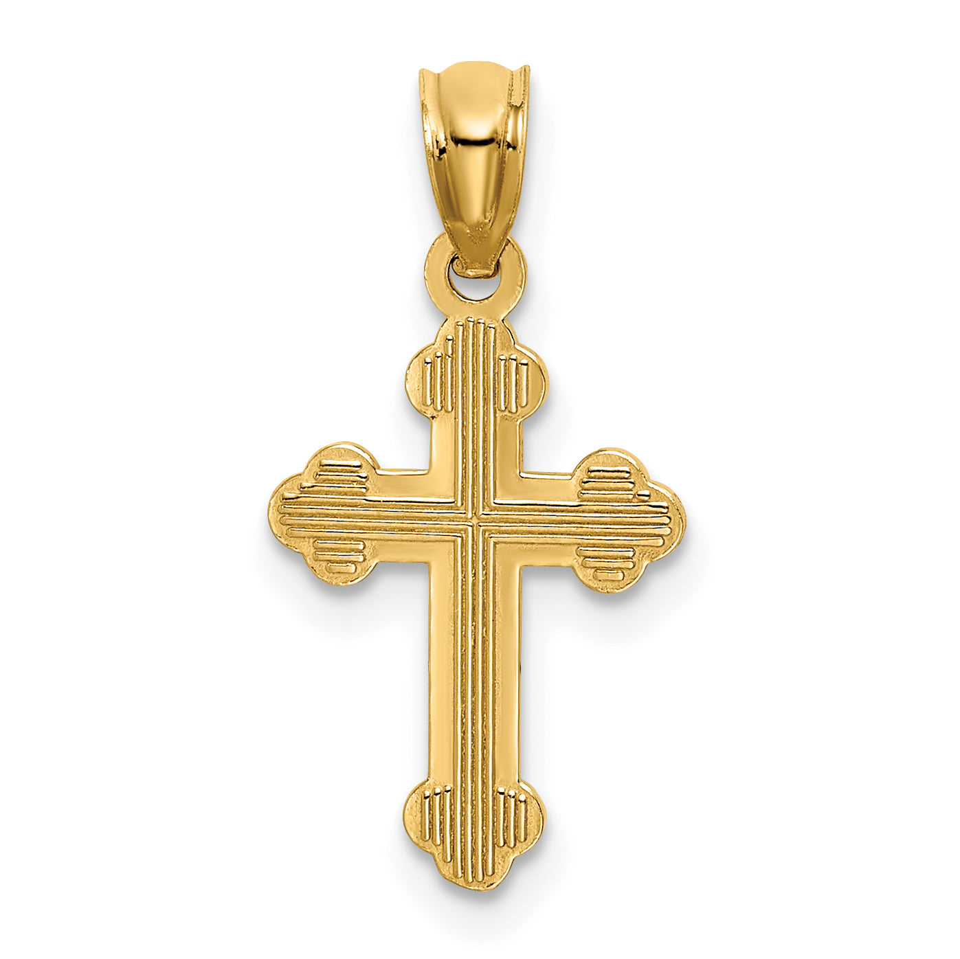 Add a touch of timeless elegance to your jewelry collection with the 14K Yellow Gold Small Budded Cross Charm. Crafted from pure 14K gold, this charm embodies the classic appeal of traditional religious motifs. Its solid structure, achieved through expert casting, ensures lasting quality and durability. With a length of 22mm and a width of 11mm, its compact design is perfect for pendants or charms. The soft yellow color of the gold gives it a warm, inviting glow. The 14K Yellow Gold Small Budded Cross Charm makes a beautiful, meaningful addition to any ensemble.