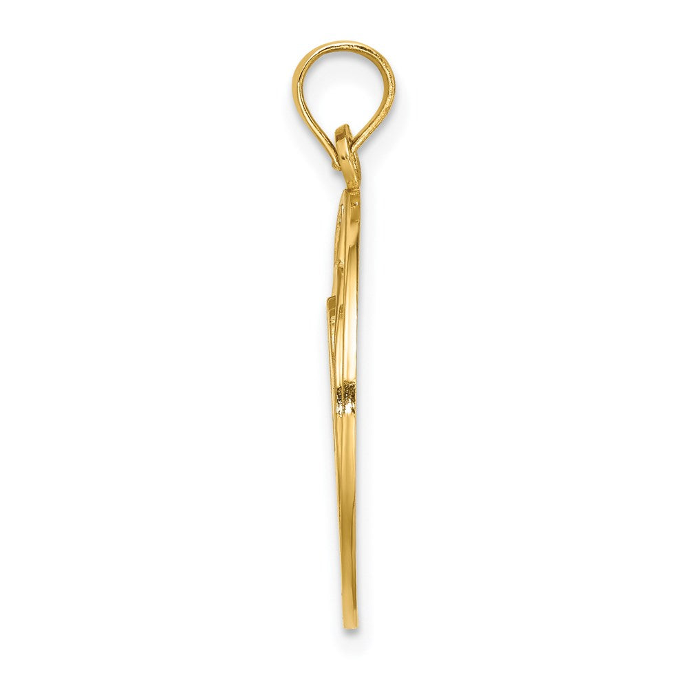 The '14k Yellow Gold ST. CROIX w/ Two Dolphins In Circle Charm' is a beautiful piece of jewelry made with high-quality, 14k yellow gold. With a weight of 1.5 grams, this charm has a polished finish and a length of 25.9 mm. The charm itself is 20.1 mm in length and width, with a thickness of 0.6 mm. The manufacturing process used to create this charm is casting. This product is sold individually and is designed to be used as a pendant or charm. The bail width is 5 mm, and the bail length is 7 mm. Its color is a classic, bright yellow gold that will stand the test of time. Its design features a circle with two dolphins, making it a perfect choice for those who love ocean-themed jewelry.