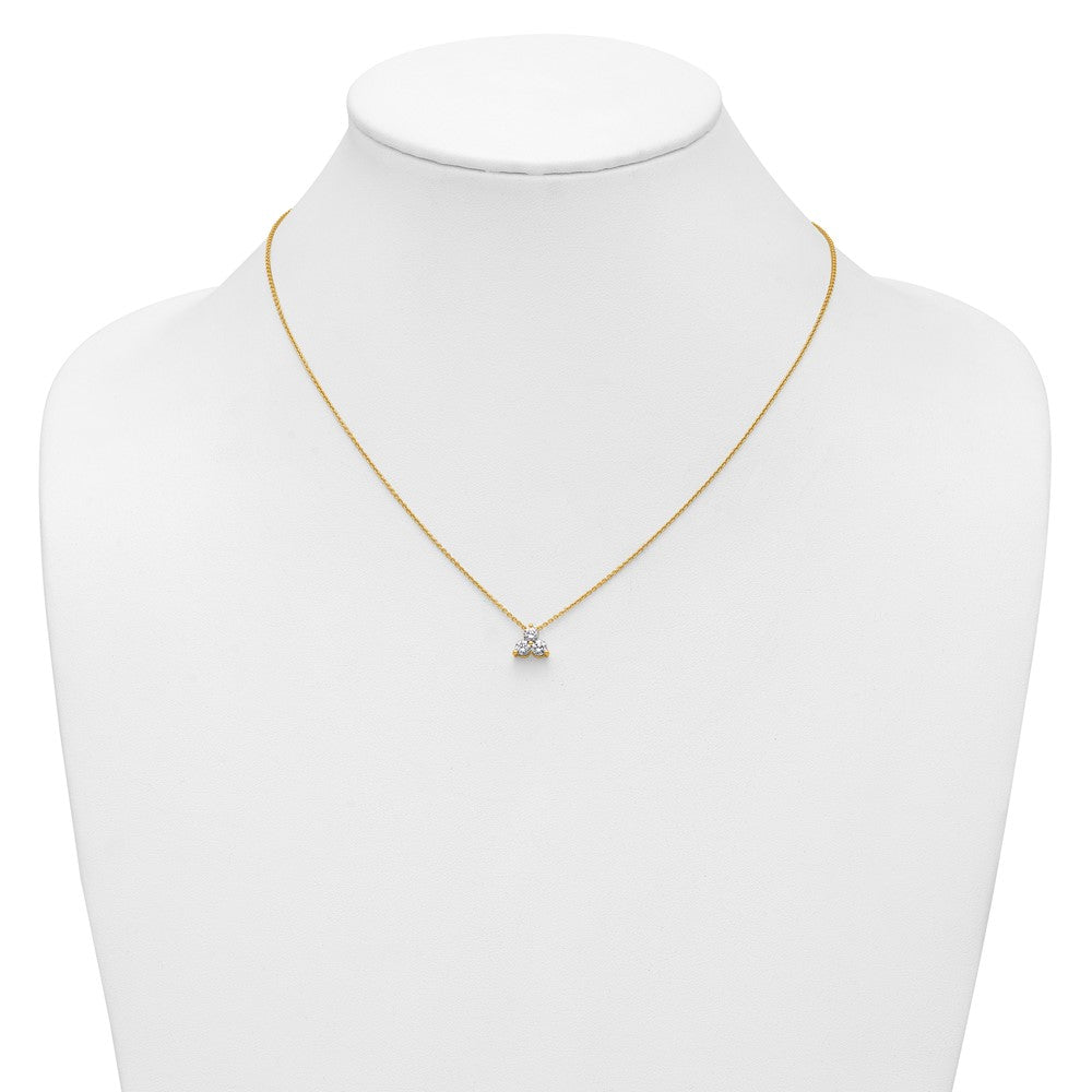 The 14K Yellow Gold True Origin 14K 1/2 Carat Lab Grown Diamond Vs D E F Three Stone 18 Inch Necklace is a stunning piece that captures elegance effortlessly. Crafted from polished 14K gold, it features three round lab-grown diamonds with a total weight of 0.17 carats, each set securely to shine bright. The VS+ clarity ensures a clear, brilliant sparkle. With a sleek 18-inch cable chain and a lobster clasp, this necklace fits comfortably and looks chic. Perfect as a gift or a treat for yourself, the jewelry piece ships in a beautiful gift box. The True Origin necklace makes a bold statement with its classic design and genuine craftsmanship.