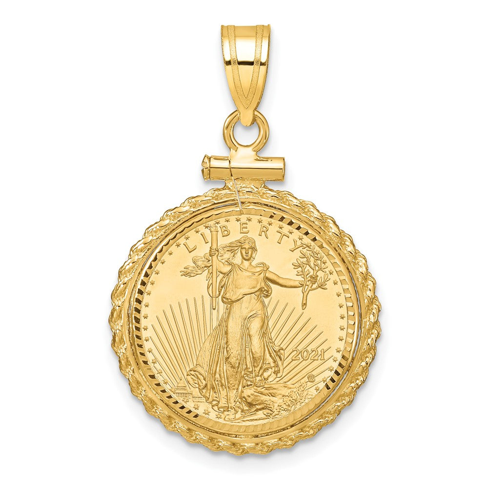 Introducing the 14K Yellow Gold Wideband Distinguished Coin Jewelry. Crafted from genuine 14K yellow gold, this pendant features a diamond-cut rope design that catches the light beautifully. Its screw-top mount secures a 1/10 oz American Eagle coin, adding both elegance and historical value. The bezel enhances its sophisticated look, making this piece a standout addition to any fine jewelry collection. Ideal for any occasion, the 14K Yellow Gold Wideband Distinguished Coin Jewelry is a timeless treasure to cherish for years.