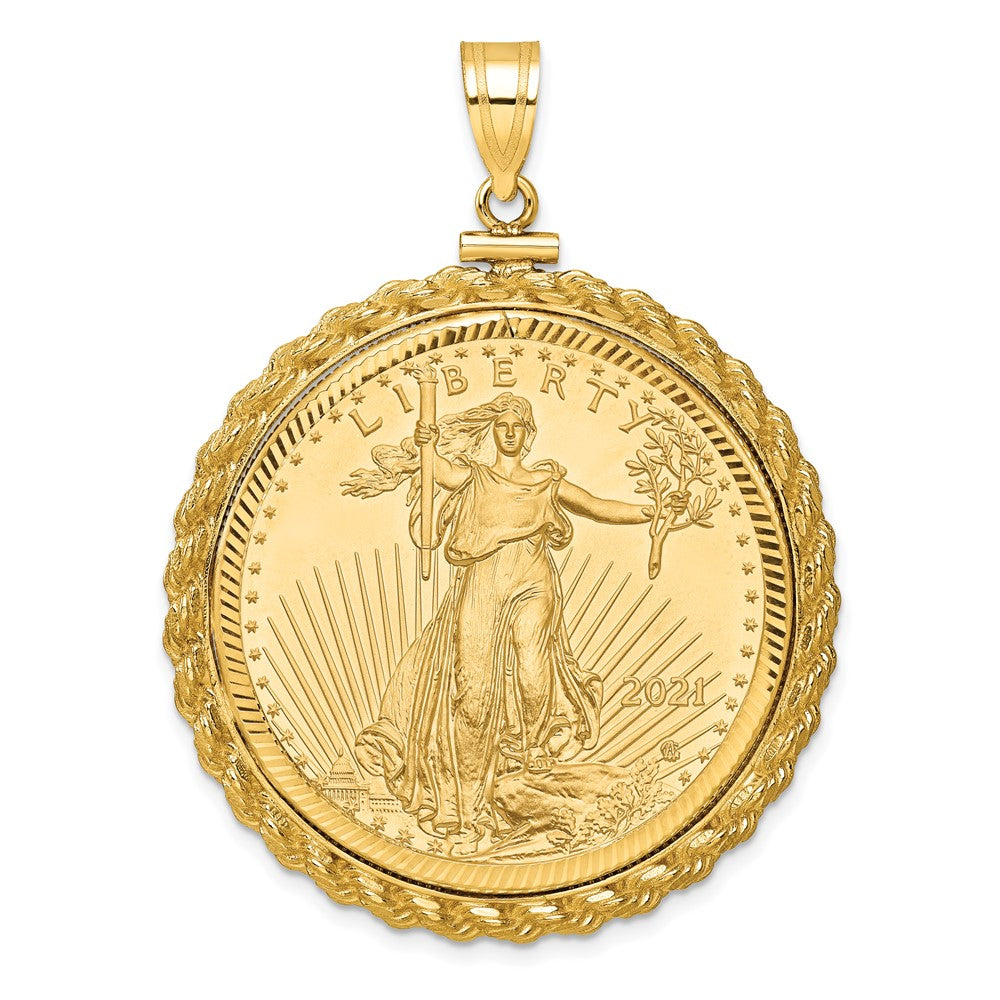 Introducing the 14K Yellow Gold Wideband Distinguished Coin Jewelry pendant. This stunning piece features a 14K yellow gold design that's both elegant and timeless. The diamond-cut casted rope adds a touch of intricate detail, while the screw-top mounting securely holds a 1-ounce American Eagle bezel. Crafted with care, this pendant combines classic beauty with modern charm, suitable for any occasion. Experience the luxury and sophistication of the 14K Yellow Gold Wideband Distinguished Coin Jewelry pendant, a perfect addition to your fine jewelry collection.