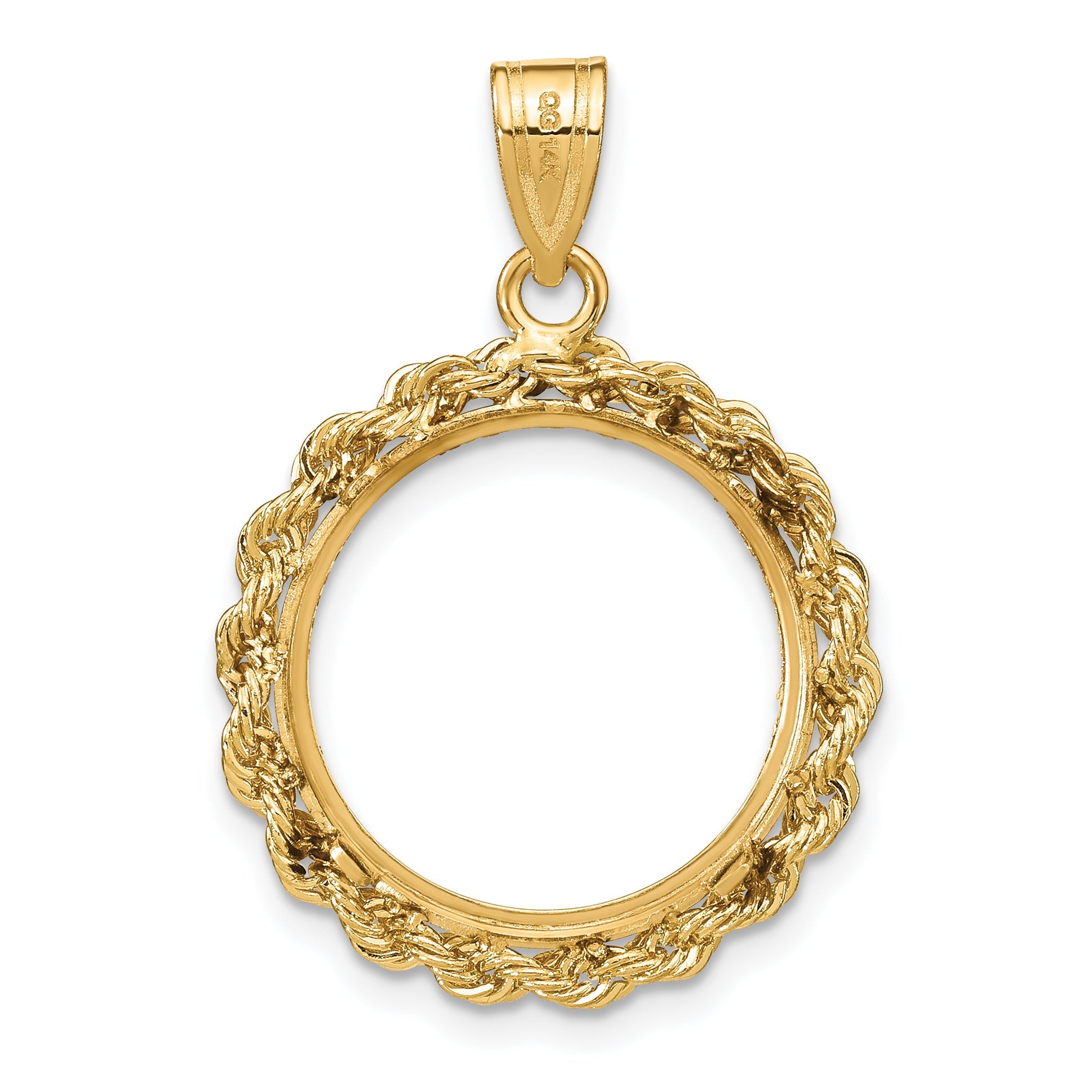 Introducing our exquisite 14K Yellow Gold Wideband Distinguished Coin Jewelry Diamond-Cut With Rope 16.5mm Prong Bezel Pendant. Crafted with 14K pure gold, this polished pendant shines with a diamond-cut texture. Designed to hold a 1/10 oz American Eagle coin securely, this piece is both functional and stylish. Its solid construction and elegant rope detailing add a touch of sophistication. Measuring 32.1 mm in length, it’s perfect for both men and women. Elevate your jewelry collection with the timeless elegance of the 14K Yellow Gold Wideband Distinguished Coin Jewelry Diamond-Cut With Rope Prong Bezel Pendant.