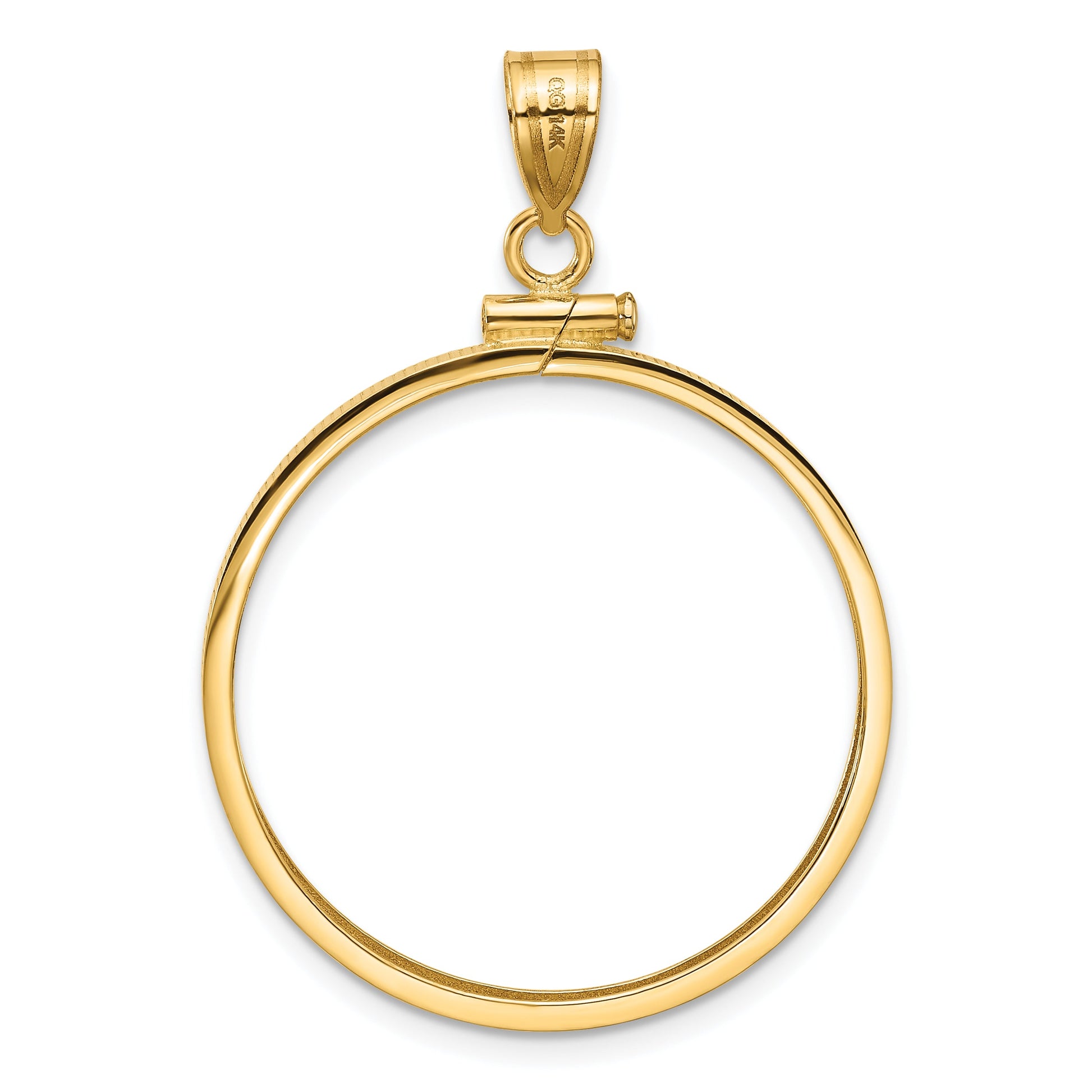 Our 14K Yellow Gold Wideband Distinguished Coin Jewelry Pendant is the perfect piece for any occasion. This polished pendant is crafted with premium 14K gold, ensuring durability and elegance. Its dimensions are 27.0mm x 2.35mm, providing a solid and substantial feel. The screw top bezel feature ensures secure mounting of your 1/2oz American Eagle coin, making this piece both functional and stylish. Measuring 38.6mm in length and 27.5mm in width, with a thickness of 3mm, it provides a bold yet refined appearance. The 14K Yellow Gold Wideband Distinguished Coin Jewelry Pendant is sold individually and designed to impress.