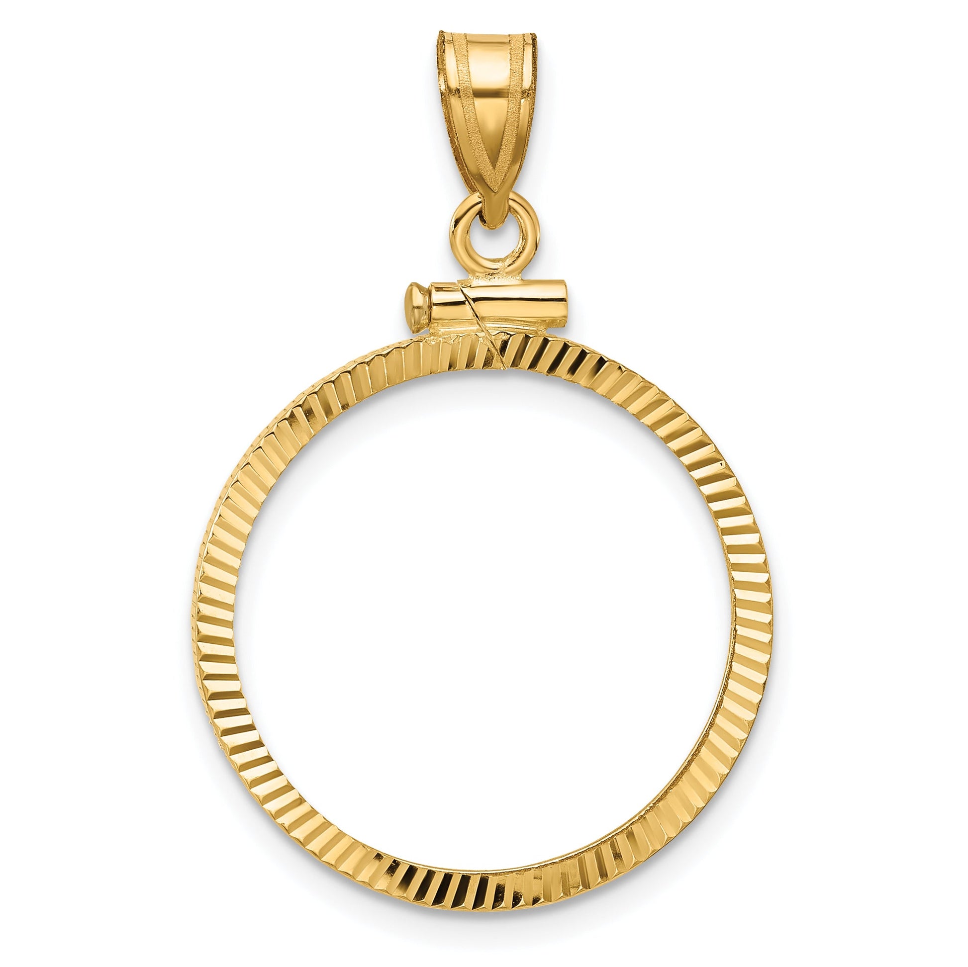 Discover the elegance of the 14K Yellow Gold Wideband Distinguished Coin Jewelry Pendant. This polished and diamond-cut piece showcases a screw top bezel with a striking 21.6mm x 1.7mm dimension. Crafted from high-purity 14K gold, its solid yellow-gold design ensures durability and timeless beauty. With a total length of 33.3mm and a charm width of 22.25mm, this pendant fits seamlessly into any jewelry collection. The unique coin bezel design adds a touch of sophistication, though please note it does not include a coin. Elevate your style with the 14K Yellow Gold Wideband Distinguished Coin Jewelry Pendant.