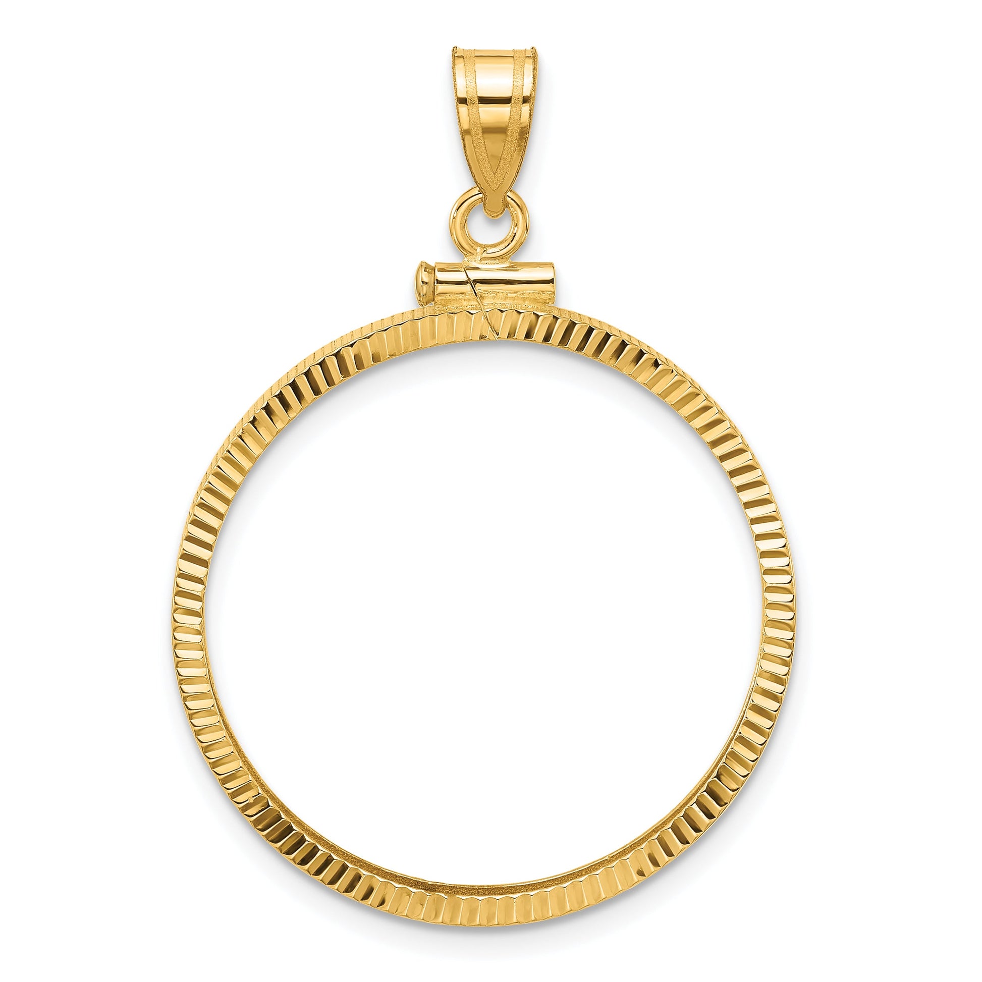 Introducing the stunning 14K Yellow Gold Wideband Coin Bezel Pendant, a true masterpiece of fine jewelry. Crafted with a polished and diamond-cut finish, this exquisite piece measures 27.5mm x 3mm and features a secure screw-top design. Perfect for holding a 1/2 oz American Eagle coin, this solid gold pendant is both elegant and versatile, suitable for any unisex style. The intricate detailing and radiant shine make the 14K Yellow Gold Wideband Coin Bezel Pendant a must-have addition to any jewelry collection.