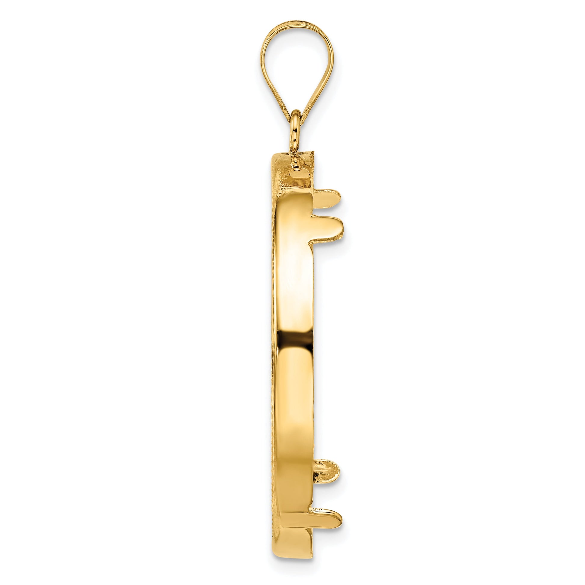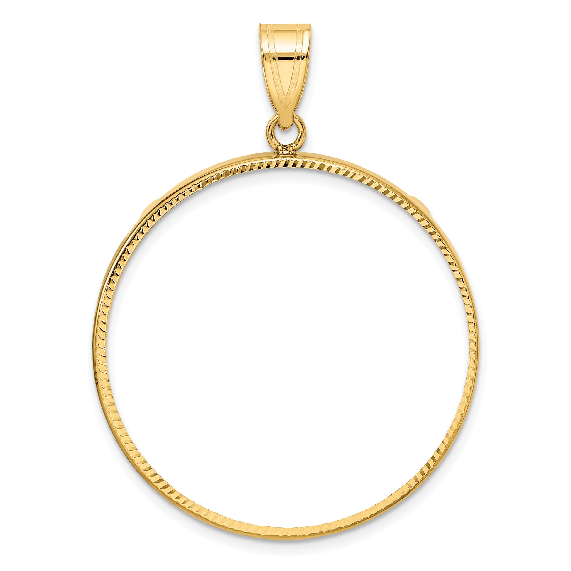 Introducing the 14K Yellow Gold Wideband Distinguished Coin Jewelry Pendant, a stunning piece crafted to perfection. This pendant features a polished finish with diamond-cut detailing, ensuring it catches the light beautifully. Measuring 32.7mm with a 3.6mm thickness, it provides a solid, substantial feel. Designed to hold a 1oz American Eagle coin, it adds a touch of timeless elegance to any outfit. The prong bezel securely holds your coin in place, making it a unique accessory for both men and women. Elevate your jewelry collection with this exquisite 14K Yellow Gold Wideband Distinguished Coin Jewelry Pendant.