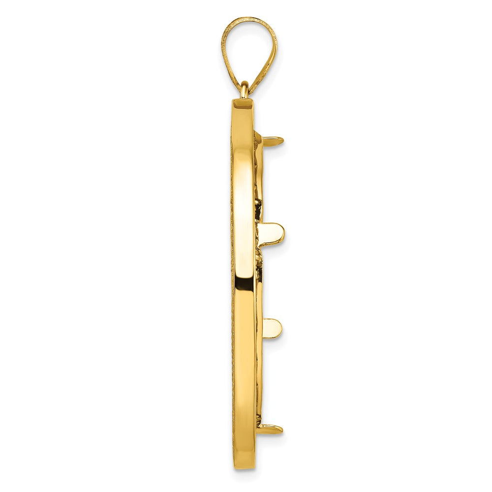 The 14K Yellow Gold Wideband Distinguished Coin Jewelry pendant is a striking addition to any fine jewelry collection. Crafted from 14K yellow gold, it boasts a polished and diamond-cut finish that catches the light beautifully. The pendant, designed to hold a 1oz American Eagle coin, features a fancy wire 32.7mm prong bezel and solid construction. With dimensions of 50.9mm in length and 41.2mm in width, this piece is both bold and elegant. The 14K Yellow Gold Wideband Distinguished Coin Jewelry pendant is perfect for anyone looking to elevate their style with a timeless piece.