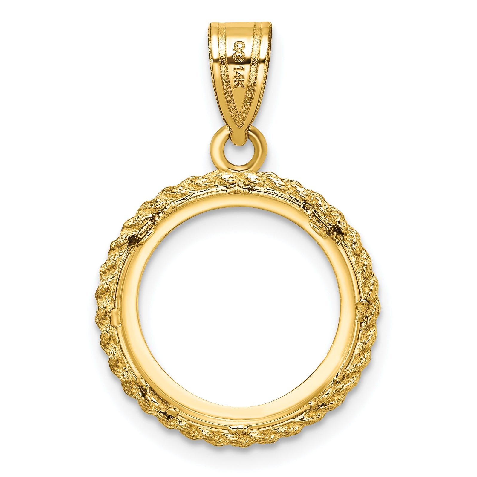 Introducing the 14K Yellow Gold Wideband Distinguished Coin Jewelry Pendant, a masterpiece of elegance and craftsmanship. This pendant features a polished and diamond-cut finish, giving it a luxurious shine. Made of solid 14K gold, it holds a 1/20 oz Panda coin securely in its prong bezel with a casted rope design. The pendant's dimensions are 26mm in length and 17.2mm in width, making it a striking accessory for any outfit. Ideal for both men and women, the 14K Yellow Gold Wideband Distinguished Coin Jewelry Pendant is a timeless addition to your collection.