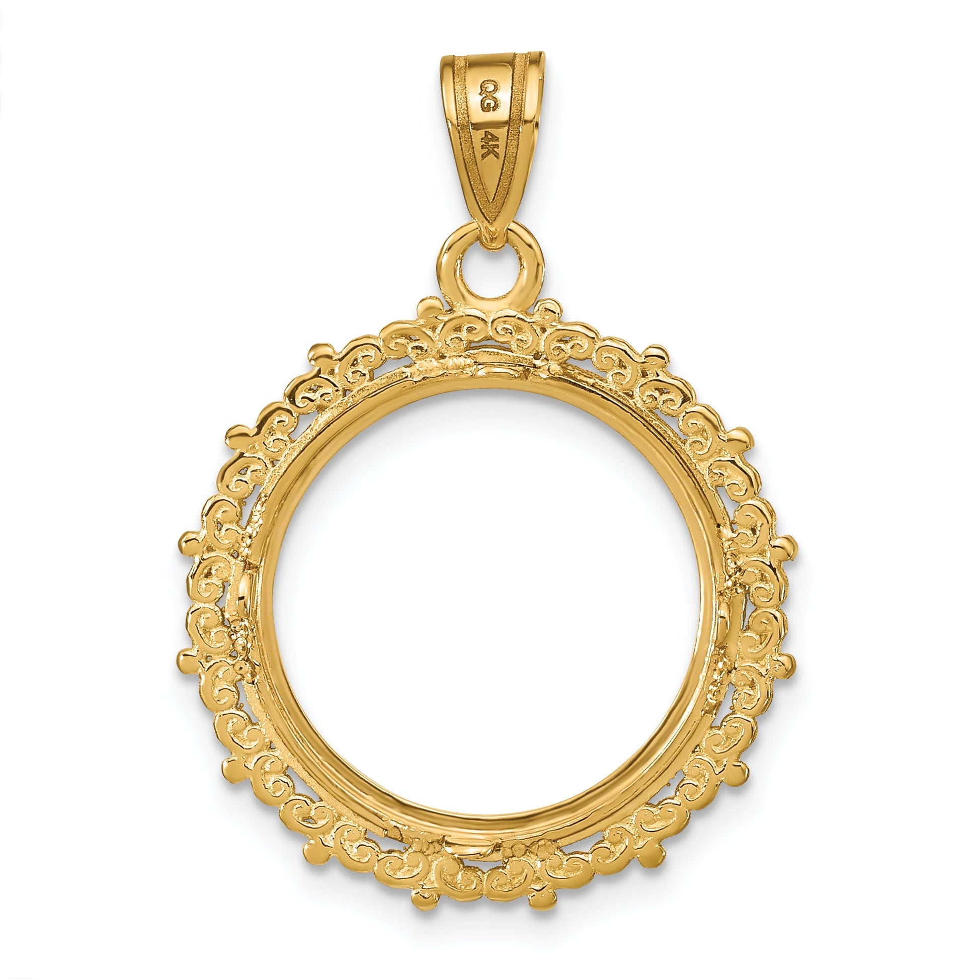 The 14K Yellow Gold Wideband Distinguished Coin Jewelry Polished Fancy Prong Bezel Pendant offers timeless elegance. Crafted from 14K gold, this pendant shines with a polished finish. At 29.4mm long and 21.5mm wide, it holds a 1/10oz American Eagle coin securely in its prong bezel mounting. This solid piece is perfect for both men and women. The jewel's rich golden hue enhances its sophisticated look. Add a touch of class to your collection with the 14K Yellow Gold Wideband Distinguished Coin Jewelry Polished Fancy Prong Bezel Pendant.