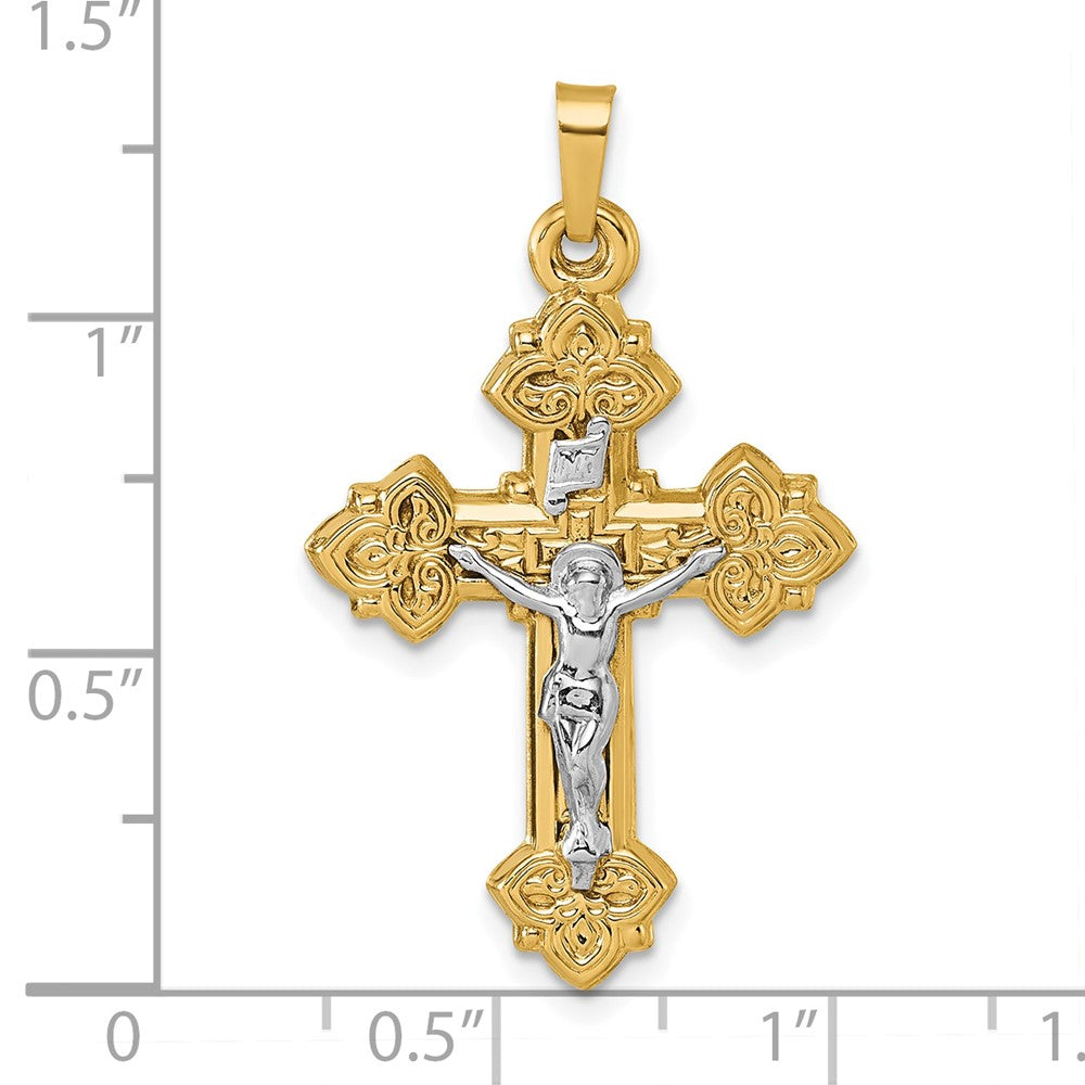 14K Yellow Gold with Rhodium Polished Fleur de Lis INRI Crucifix Cross Pendant