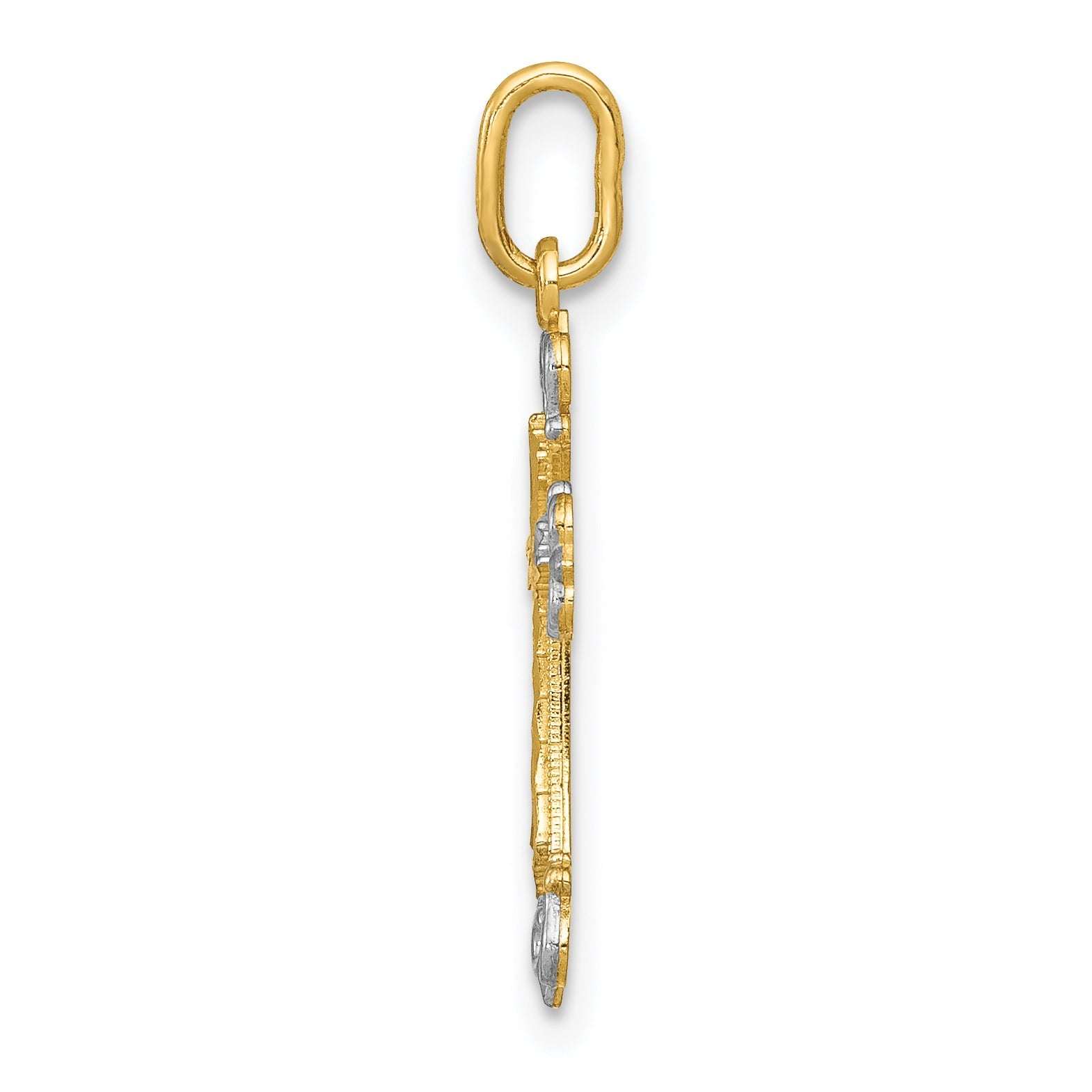 Introducing the 14K Yellow and Rhodium Cross Charm, a fine jewelry piece for the sophisticated style. Hand-crafted to perfection, its main material is gold, featuring a yellow color. This pendant weighs in grams as a testament to its solid build. Accentuated with rhodium plating, the charm presents a striking white accent color. Measuring 23 mm in length and 11 mm in width, this is a themed pendant. A Flat Back Profile completes the design. Treat yourself or a loved one with this exquisite, solid cross charm. Each unit is sold individually. This 14K Yellow & Rhodium Cross Charm is a great addition to any jewelry collection.