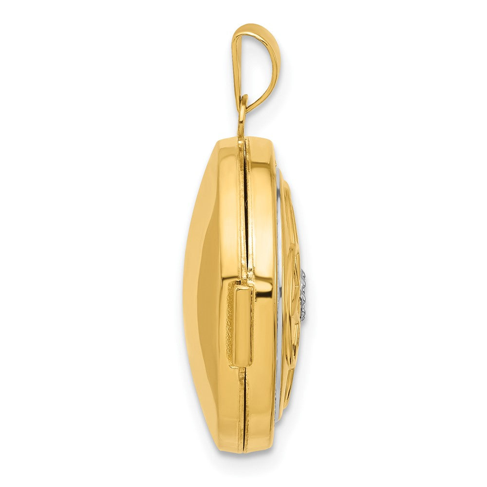 The 14K Yellow & Rhodium 14K w/ White Rhodium 22mm Fancy Diamond Round Locket Pendant is a stunning piece of jewelry that effortlessly blends elegance with personal flair. Crafted from lustrous 14K yellow gold, this locket features a sparkling white diamond at its center, weighing .005 carats. The polished finish and textured design create a unique visual appeal. This locket opens to hold two cherished photos, measuring up to 17.15 x 17.3 mm each. Engravable and perfect for women, the 14K Yellow & Rhodium locket serves as a beautiful keepsake for any special occasion.