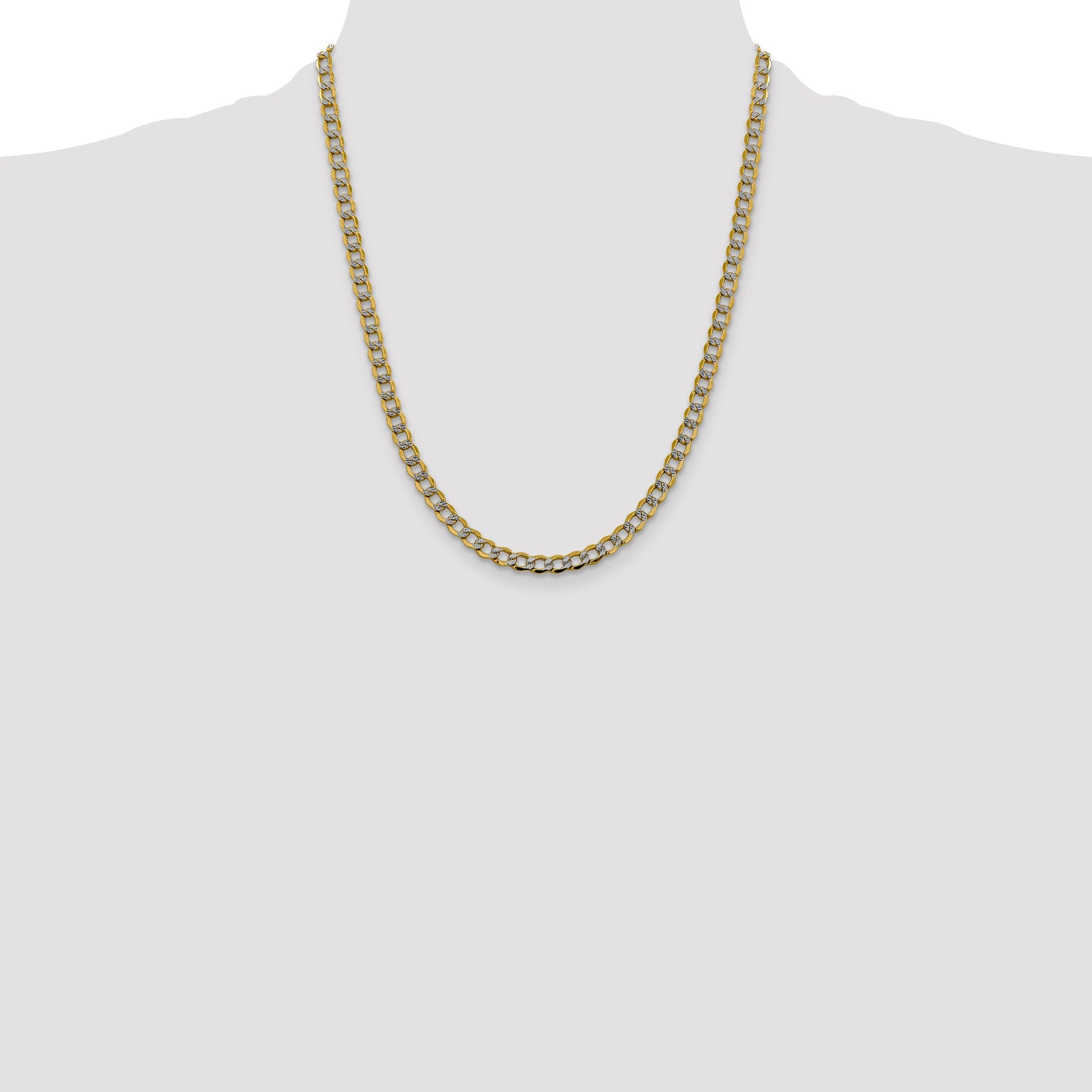 Discover the classic charm of the 14K Yellow & Rhodium 22 Inch 5.2mm Semi-Solid With Pavé Curb Lobster Clasp Chain. This stunning piece features a polished finish with a white rhodium accent that adds a touch of elegance. Made from 14K gold, its semi-solid design ensures lasting quality, striking the perfect balance between durability and comfort. The 5.2mm curb chain showcases exquisite pave texture, giving it a unique flair. The lobster clasp ensures secure wear while adding to its sophistication. Elevate any outfit with the timeless 14K Yellow & Rhodium 22 Inch chain, a must-have for every jewelry collection.