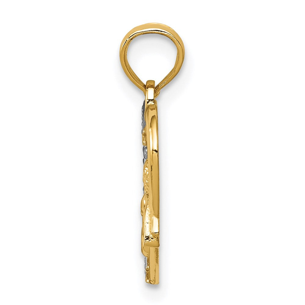 The 14K Yellow & Rhodium Angel in Heart with Star Pendant is a treasured piece for your collection. Crafted from 14K gold with rhodium plating, it shines with elegance. This pendant features a delicate angel nestled within a heart, accented by a radiant star design. Measuring 17 mm in length, it's the perfect size to add a touch of charm to any outfit. Solid and casted, this pendant ensures lasting beauty. The 5 mm bail makes it easy to wear on your favorite chain. Embrace grace with this exquisite 14K Yellow & Rhodium Angel in Heart with Star Pendant.