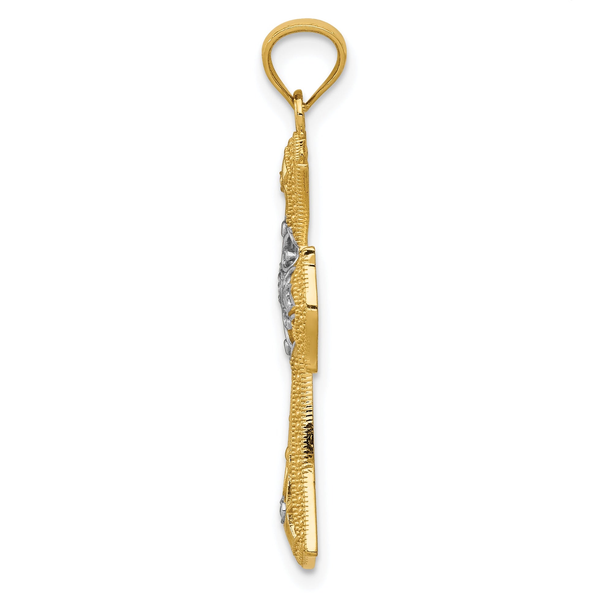 Experience elegance with our 14K Yellow and Rhodium W/Rhodium Diamond-Cut Cross Pendant. This stunning piece, made from pure 14K gold, showcases a diamond-cut design that brings out a brilliant shine. Measuring 28 mm in length and 18 mm in width, it features a rhodium plating that adds to its luxurious appeal. The solid, casted manufacturing ensures durability, while the concave profile offers a unique texture. Whether for daily wear or a special occasion, the 14K Yellow and Rhodium W/Rhodium Diamond-Cut Cross Pendant makes a timeless addition to any jewelry collection.