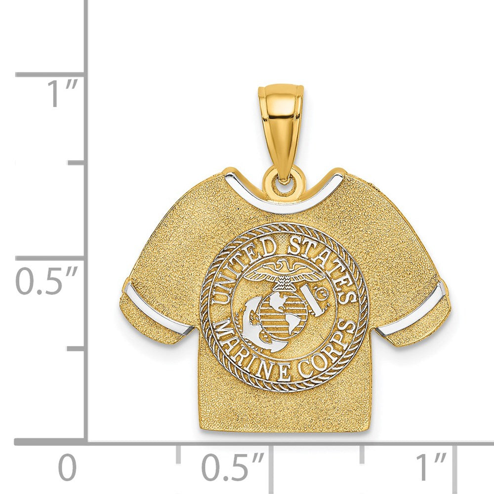 This is a US Marine Corps T-shirt charm made of 14k yellow and rhodium gold. It weighs 2.87 grams and measures 19mm in length and 23.6mm in width. The charm has a textured design and a textured back, and is licensed by the United States Marine Corps. It comes with a 5mm wide and 7mm long bail, and is sold as a single unit.