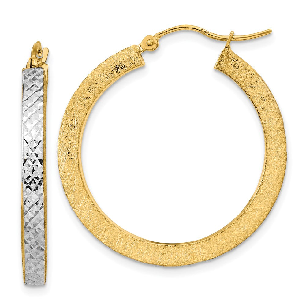Discover the timeless elegance of the 14K Yellow & Rhodium with White Polished Satin Diamond-Cut Hoop Earrings. Crafted from pure 14K gold, these earrings showcase a stunning blend of yellow and rhodium accents, bringing out a captivating touch of class. The hoops, skillfully finished with a polished and brushed texture, offer a radiant sparkle with their unique diamond-cut design. Measuring 32.19 mm in length and 3.1 mm in thickness, these hoops feature a secure wire and clutch closure, perfect for any occasion. Make a statement with these exquisite 14K Yellow & Rhodium Diamond-Cut Hoop Earrings.