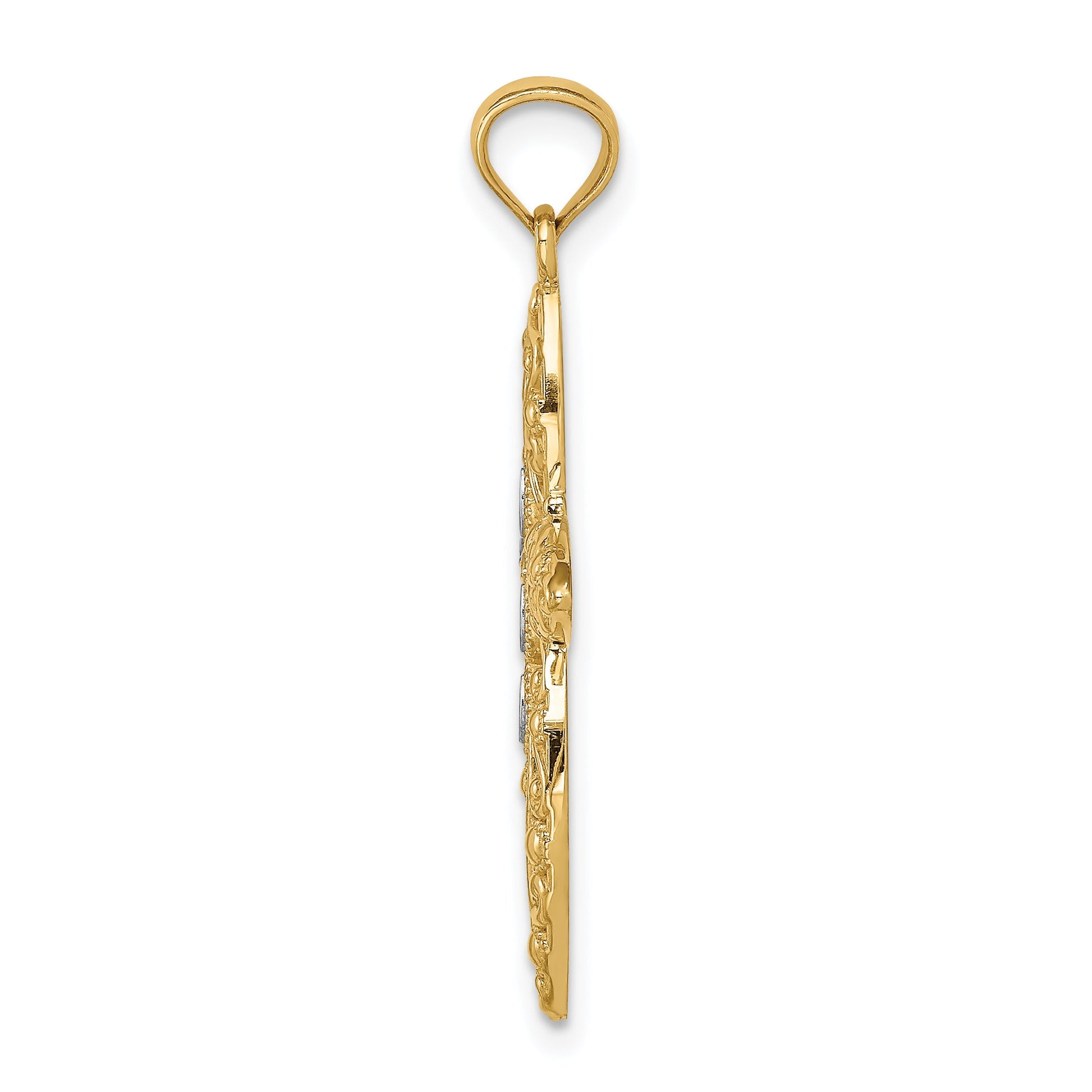 The 14K Yellow & Rhodium White D/C Passion Cross Pendant is a stunning piece of fine jewelry. Crafted with polished 14K yellow gold and rhodium plating, it captures both elegance and timeless beauty. Measuring 30 mm in length, this pendant has a solid, diamond-cut texture, showcasing intricate details. The concave profile adds depth, while the contrasting yellow and silver tones make it stand out. Ideal for any occasion, the 14K Yellow & Rhodium White D/C Passion Cross Pendant offers a blend of classic and contemporary design.