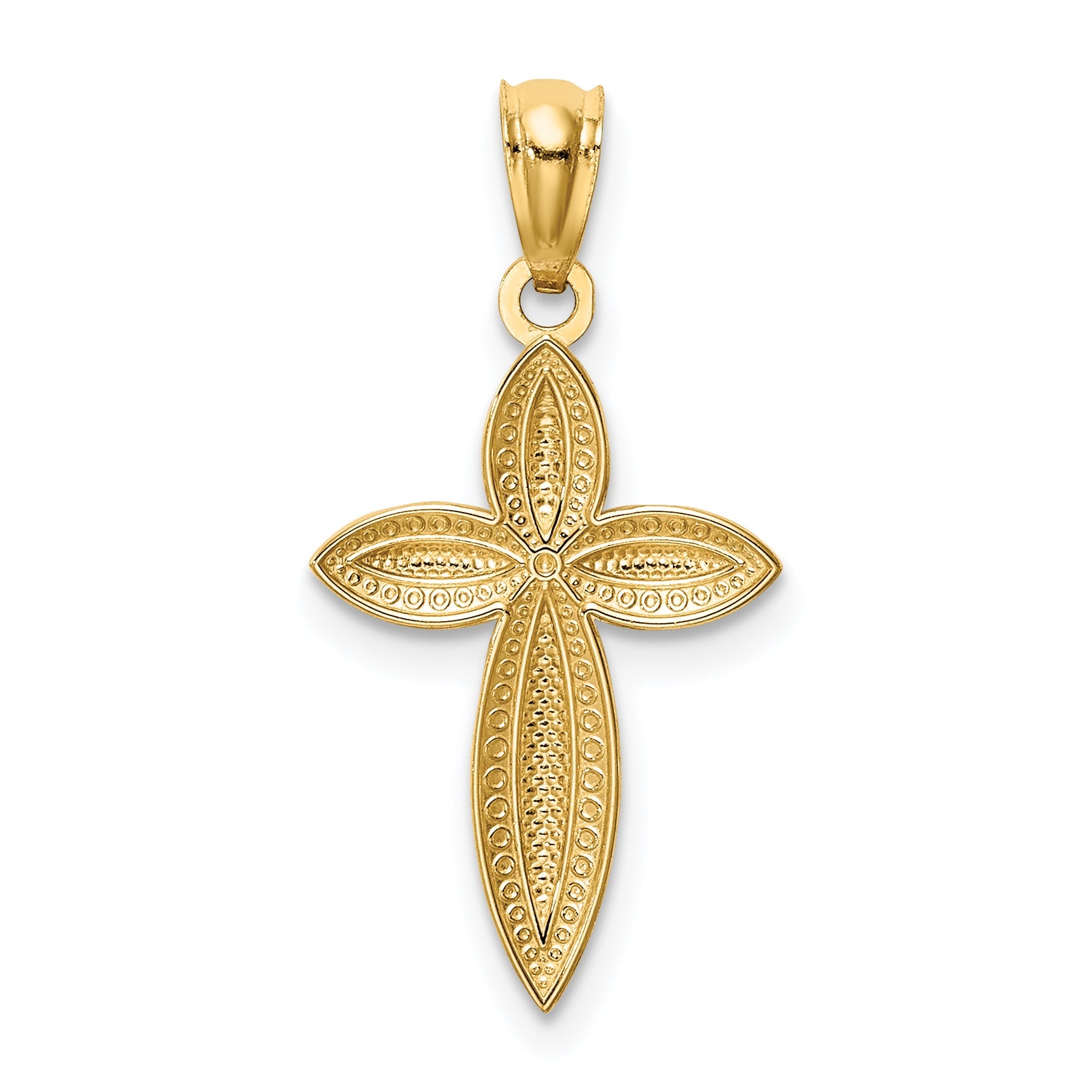 The 14K Yellow & Rhodium White Passion Cross Pendant is a beautiful addition to any jewelry collection. Crafted from 14K gold, this polished pendant features a stunning contrast with its rhodium white accents. Measuring 25 mm in length, it showcases a solid, durable design perfect for everyday wear. The concave profile adds depth and dimension, making it a standout piece. The yellow gold base plated in a silver tone brings a unique blend of elegance and charm. Elevate your style with the timeless beauty of the 14K Yellow & Rhodium White Passion Cross Pendant.
