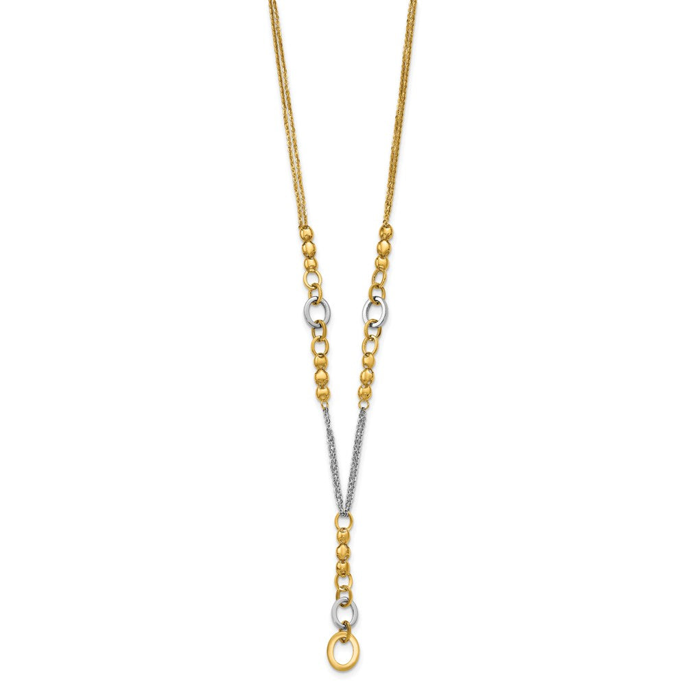 The 14K Yellow & Rhodium 14K W/White Rh Polished Fancy 2-Strand Oval Link Necklace is a stunning piece that adds elegance to any outfit. Featuring a dual-strand design with oval links, it offers a chic, layered look. The bright yellow gold is complemented by white rhodium accents, giving it a modern shine. Crafted from high-quality 14K gold, it’s lightweight and comfortable. The 18-inch chain has a secure lobster clasp and a polished finish for a sleek look. This fancy necklace is built to last with a lifetime guarantee, making it a perfect choice for style and durability.