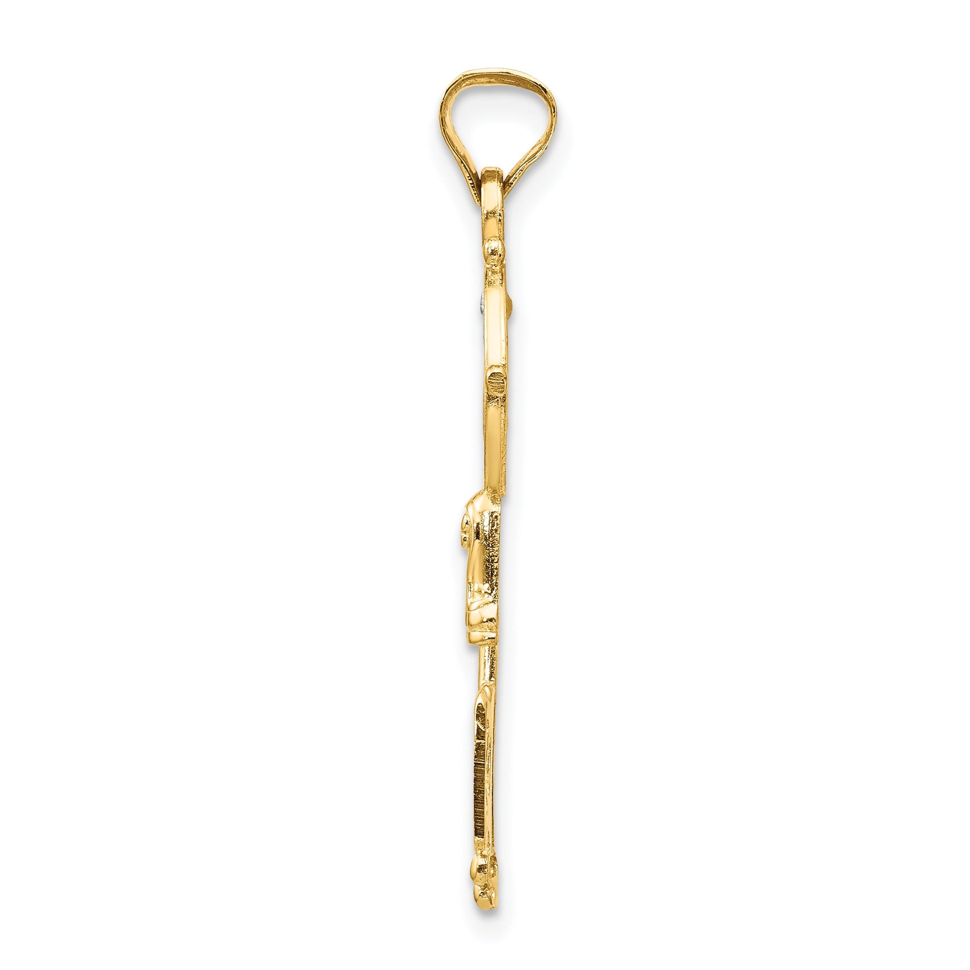 Discover elegance with our 14K Yellow & Rhodium With Cross Key Pendant. This eye-catching piece combines the rich glow of yellow gold with the sleek touch of rhodium, offering a timeless charm. Crafted with precision, it measures 34.25 mm in full length and 11.6 mm in width, perfect for any occasion. The pendant stands out with its solid, textured design, and a uniquely themed cross key motif. Its reversible feature adds versatility, enhancing its allure. Elevate your style with the 14K Yellow & Rhodium With Cross Key Pendant today.