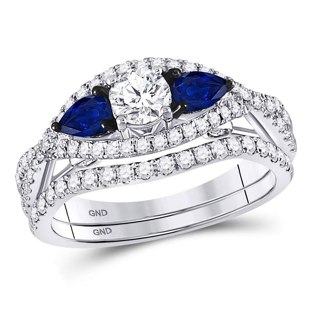 14kt White Gold Round Diamond Blue Sapphire Bridal Wedding Ring Set 1-3/8 Cttw