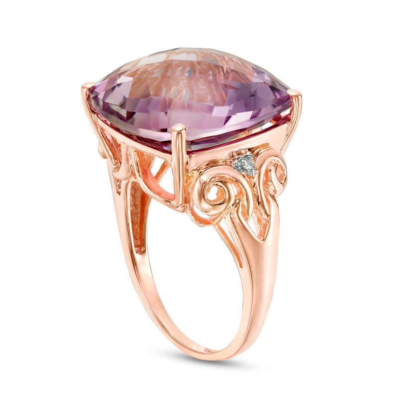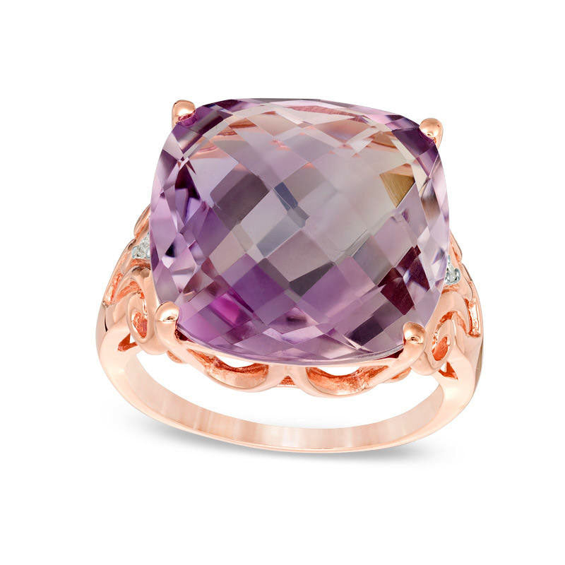 This stunning gemstone ring is sure to make a statement. Made from luxurious 10K rose gold, it features a beautiful 15.0mm cushion-cut Rose de France amethyst in a soft purple hue. The shank of the ring is adorned with intricate filigree designs and sparkling diamond accents, adding a touch of elegance to the already magnificent piece. With a polished finish, this ring is guaranteed to turn heads and receive compliments.