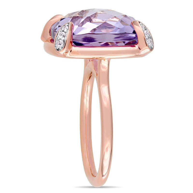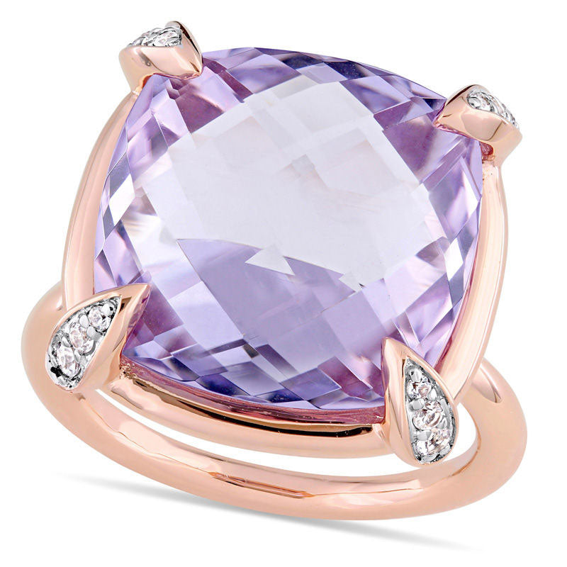 15.0mm Faceted Cushion-Cut Rose de France Amethyst and White Sapphire Ring in Solid 14K Rose Gold