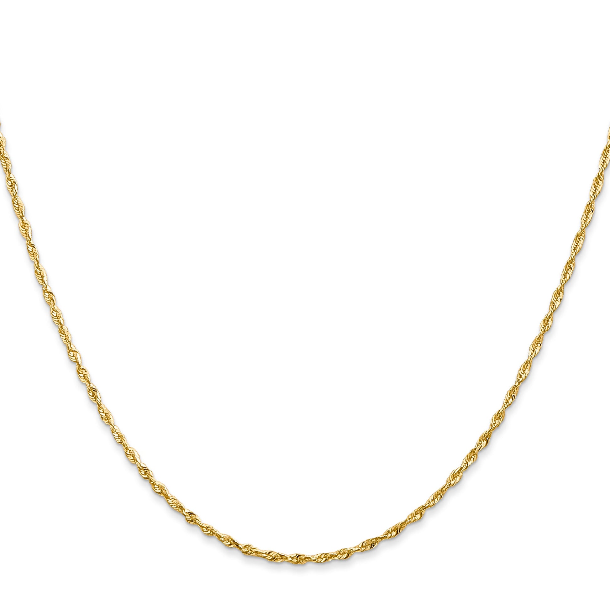 Introducing the 16 Inch 10K 1.5mm Diamond-Cut Lightweight Rope Chain, a versatile piece for any jewelry lover. Crafted from 10K yellow gold, this chain features a polished finish and intricate diamond-cut texture that captures light beautifully. Its 1.5mm width provides a delicate, yet durable feel, perfect for everyday wear. The lobster clasp ensures a secure fit, while the 16-inch length makes it ideal for layering or wearing solo. Engineered with a solid, extruded wire design, this chain guarantees life-long wear. Add a touch of elegance to your collection with the 16 Inch 10K 1.5mm Diamond-Cut Lightweight Rope Chain.