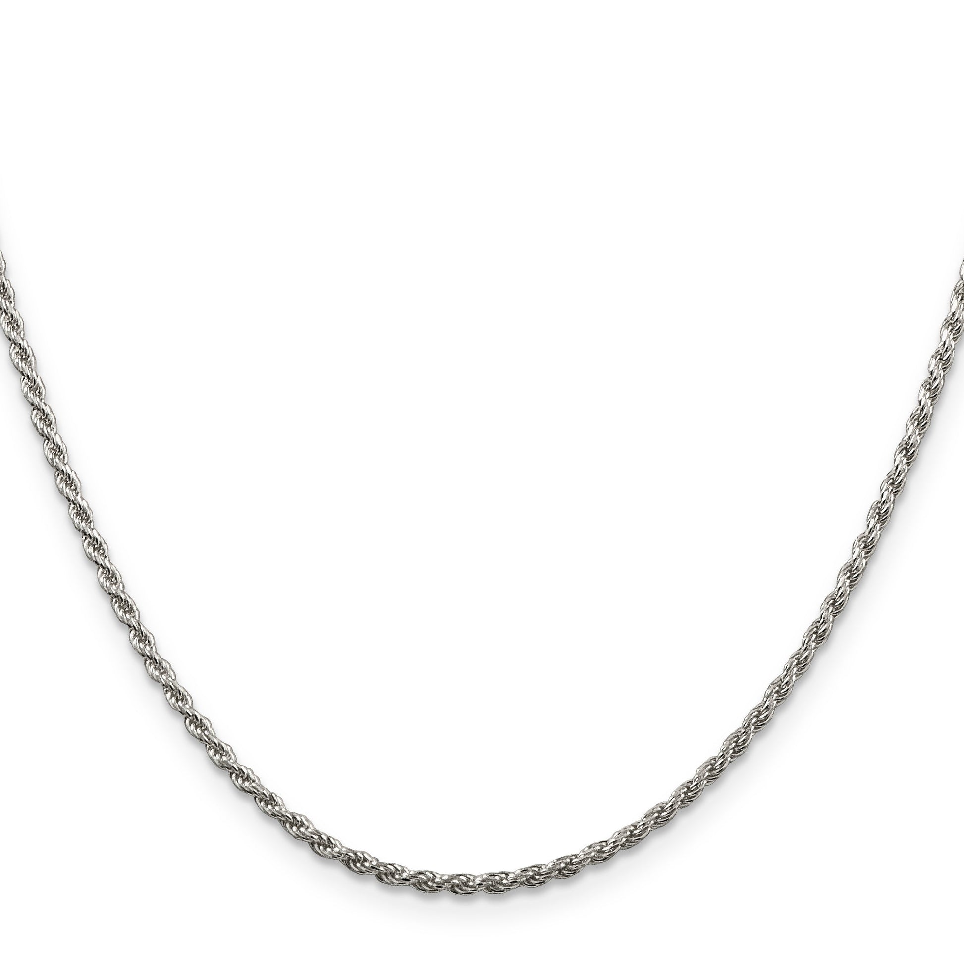 The 16 Inch Sterling Silver Rhodium-Plated 1.85mm Diamond-Cut Rope Chain is a stunning addition to any jewelry collection. Crafted from 925 sterling silver, this chain boasts a durable rhodium plating that enhances its shine and longevity. Its diamond-cut texture adds brilliance, making it catch light at every angle. Measuring 1.85mm in width, the chain combines elegance and strength in a sleek rope design. The lobster clasp offers secure fastening, ensuring this solid, polished piece stays comfortably in place. Ideal for women, the 16 Inch Sterling Silver Rhodium-Plated Chain is perfect for both daily wear and special occasions.