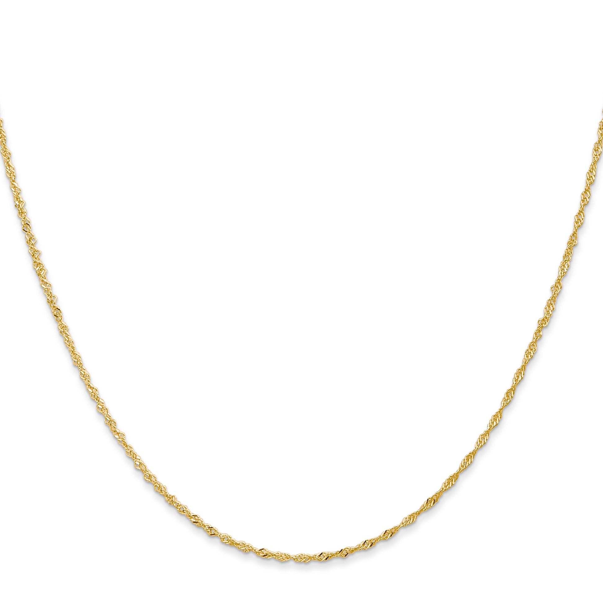 The 18 Inch 14K 1mm Singapore With Spring Ring Clasp Chain is a timeless piece of fine jewelry perfect for any collection. Crafted from 14K polished gold, this 18-inch chain shines with elegance. The Singapore link design, measuring 1mm in width, adds a delicate touch, while the spring ring clasp ensures a secure fit. Nickel-free and machine-made, it offers both beauty and durability. The chain also features a rhodium plating, adding an extra layer of sophistication. Invest in lasting elegance with the 18 Inch 14K 1mm Singapore With Spring Ring Clasp Chain.