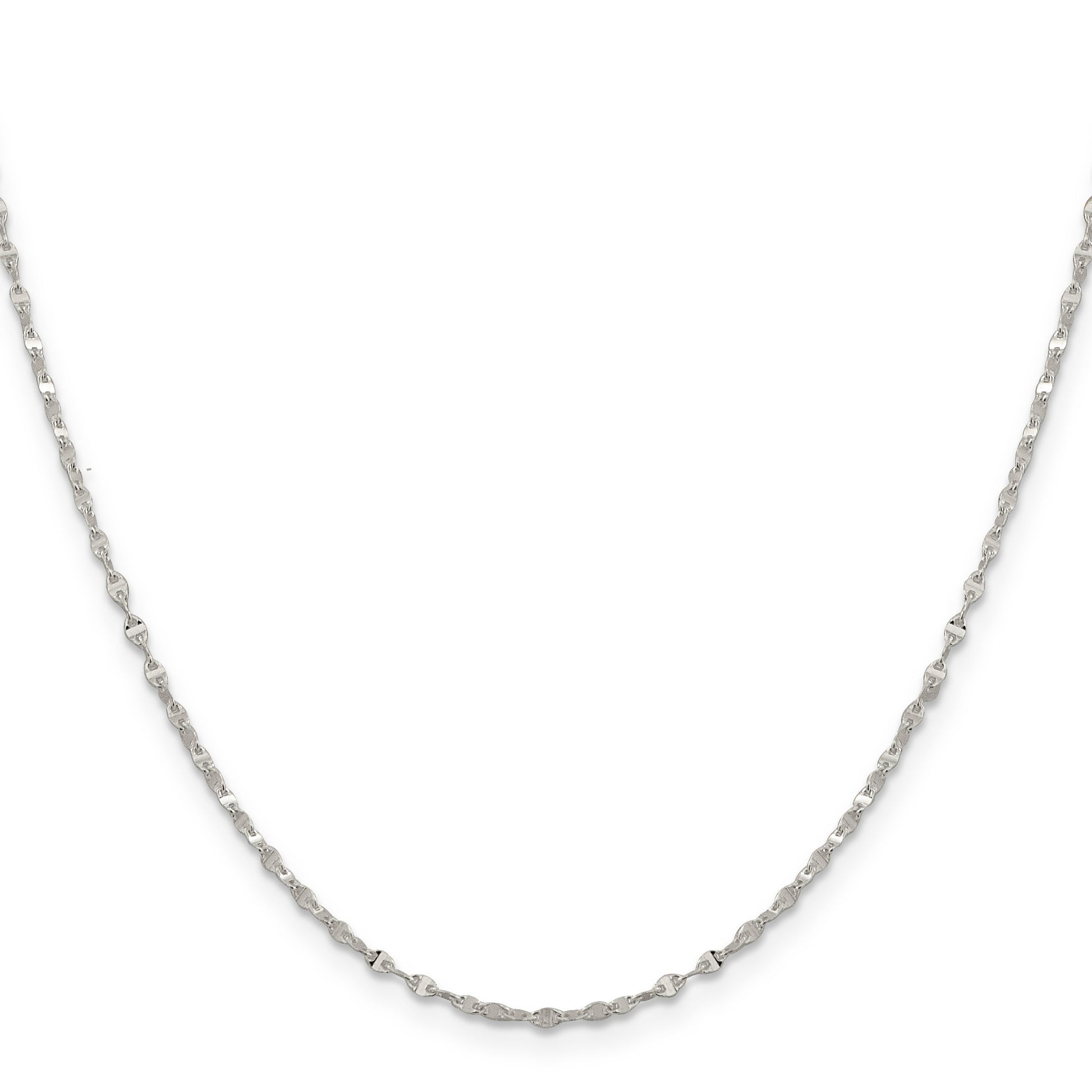 The 18 Inch Sterling Silver 1.75mm Fancy Wave Flat Link Chain showcases elegance and timeless style. Crafted from polished 925 sterling silver, this necklace gleams with its anti-tarnish finish. The chain measures 18 inches in length and features a 1.75mm width that brings a touch of subtle sophistication to any outfit. Its wave-like links create a unique look, while the lobster clasp provides secure wear and easy handling. Beautifully machine made with a solid structure, this women's chain necklace is a fine piece of jewelry that complements any neckline with its graceful silhouette.