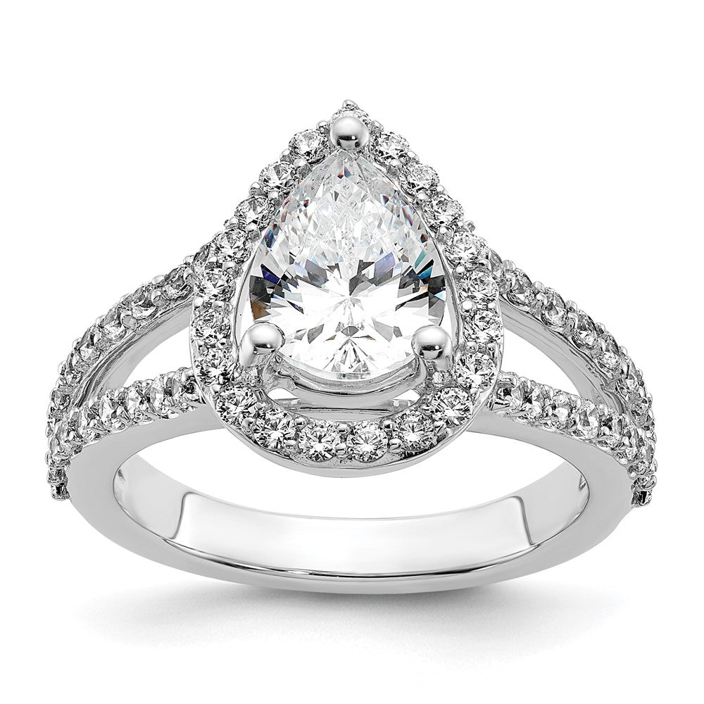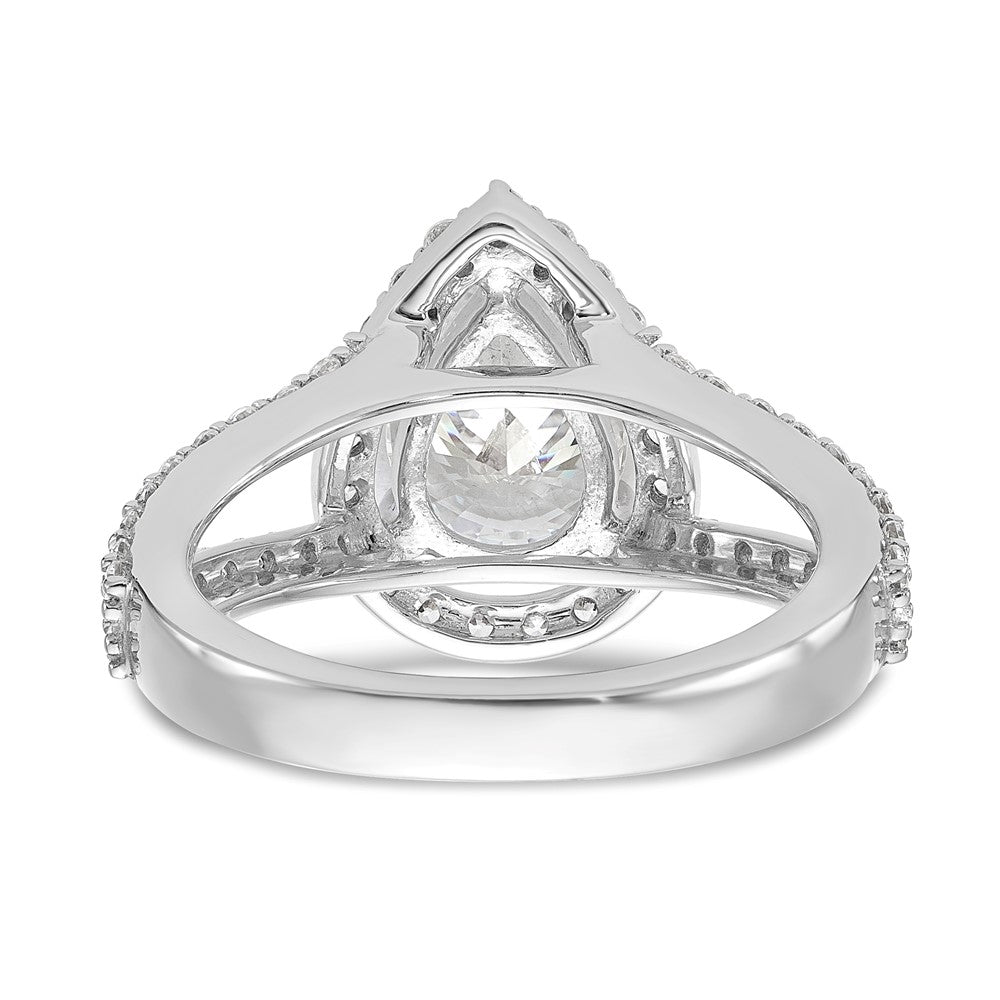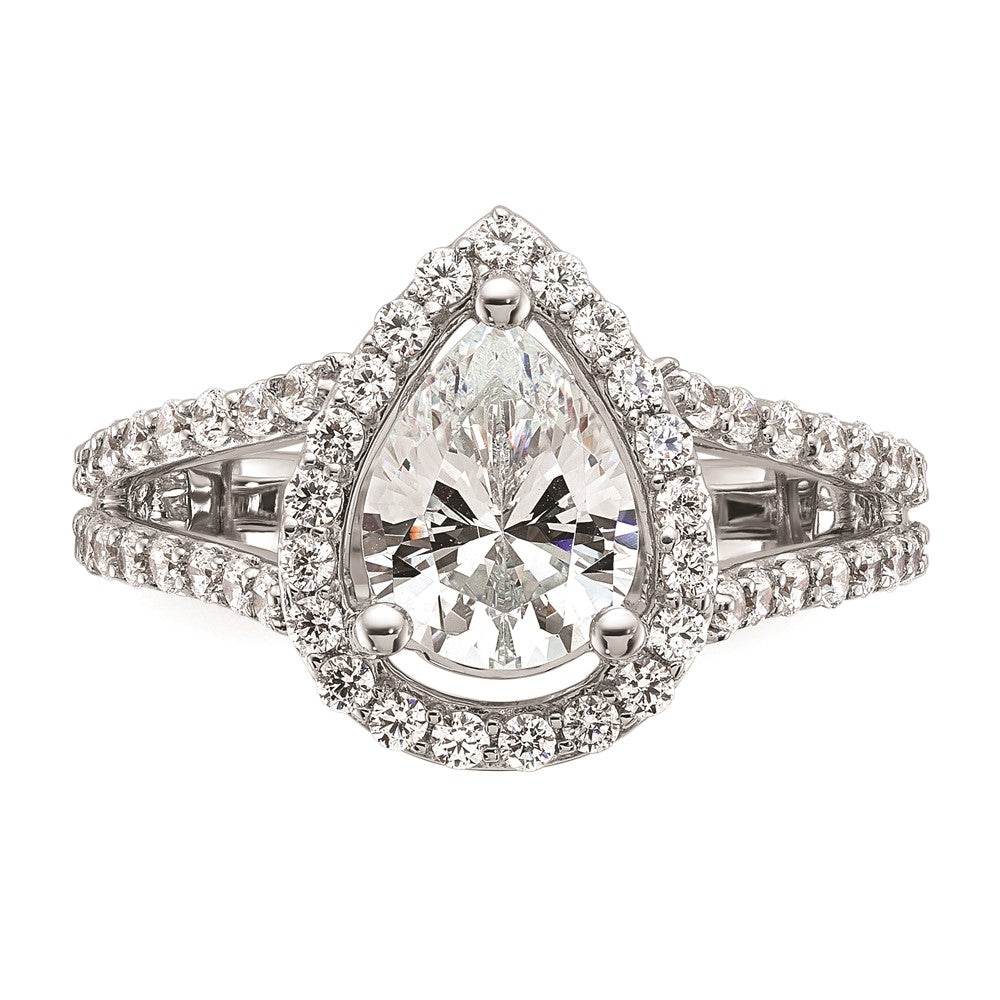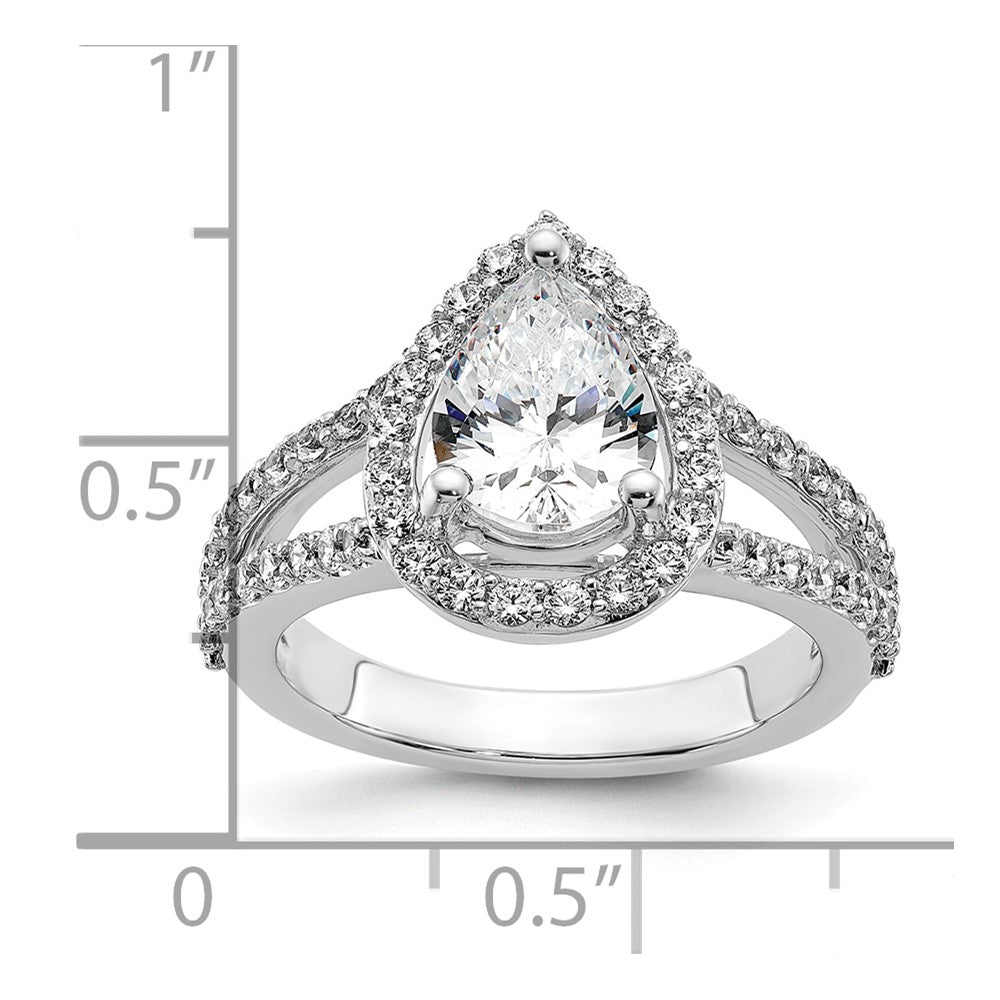 This beautiful ring is semi-mount which means it does not include the center stone. It is available in sizes 6 to 8 with 0.25 sizing adjustment increments. It has a tapered band width ranging from 3.8 to 2.8 mm and a head height of 5 mm. The center stone is a 2 ct pear-shaped AAA quality cubic zirconia and the surrounding stones are 0.015 ct round-cut cubic zirconia with an I1 (AA) stone clarity. The ring is rhodium-plated for added durability and shine. Engraving is not recommended for this ring.