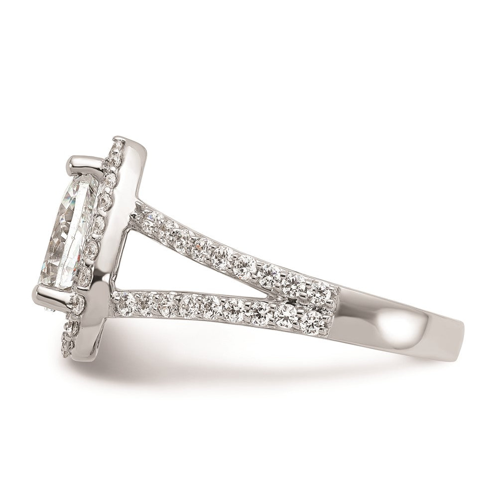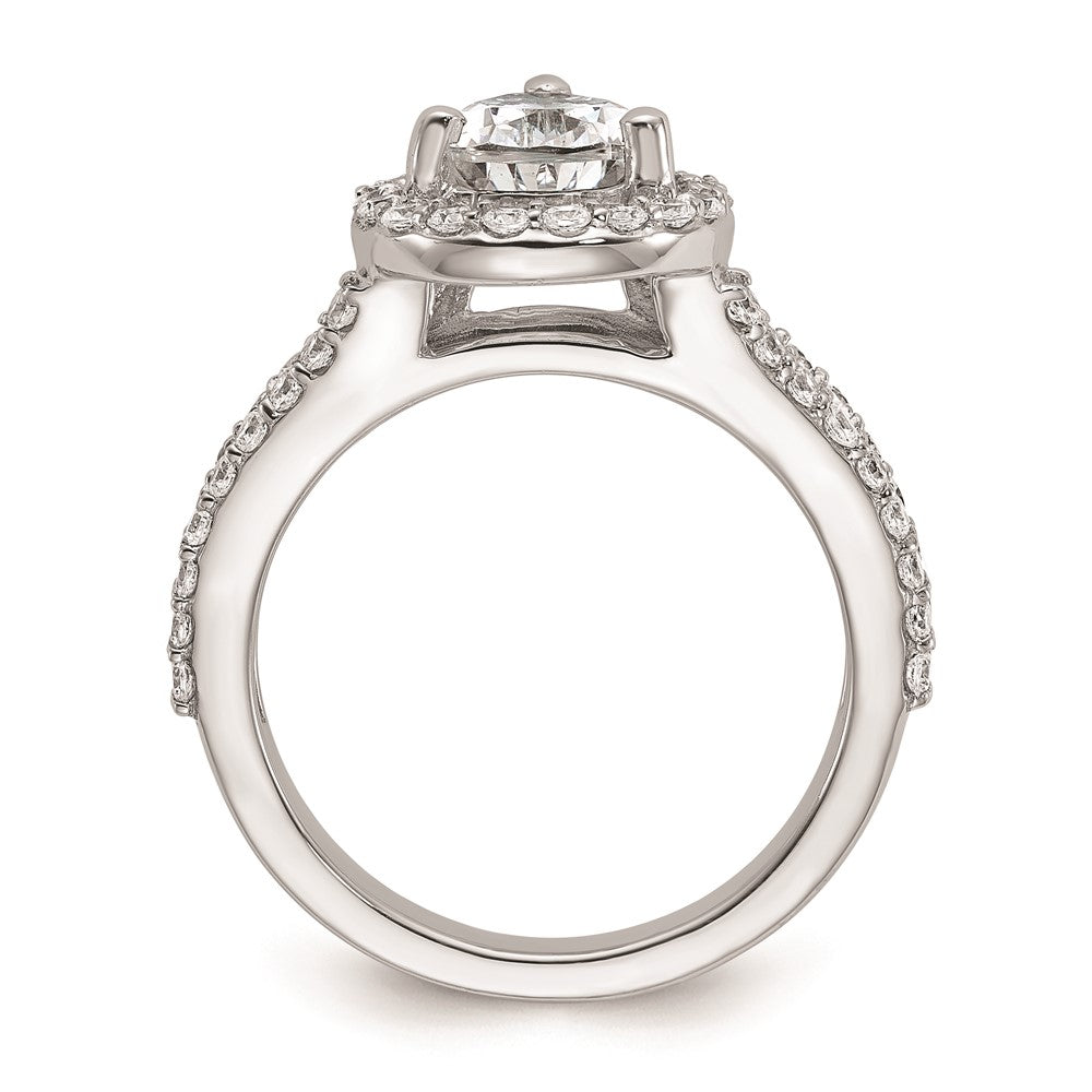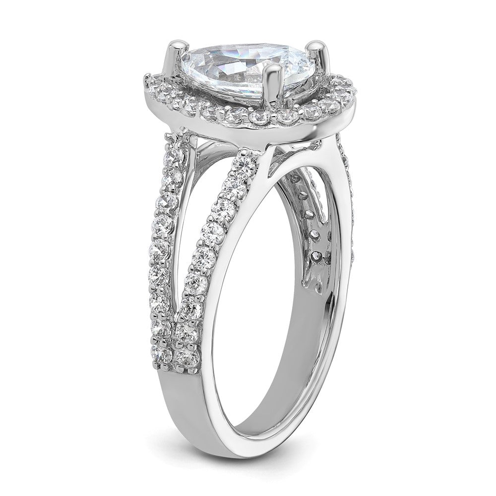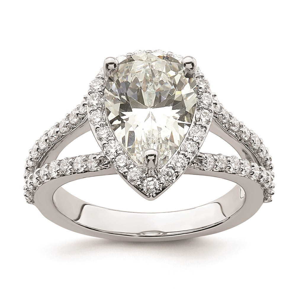 This beautiful ring is semi-mount which means it does not include the center stone. It is available in sizes 6 to 8 with 0.25 sizing adjustment increments. It has a tapered band width ranging from 3.8 to 2.8 mm and a head height of 5 mm. The center stone is a 2 ct pear-shaped AAA quality cubic zirconia and the surrounding stones are 0.015 ct round-cut cubic zirconia with an I1 (AA) stone clarity. The ring is rhodium-plated for added durability and shine. Engraving is not recommended for this ring.