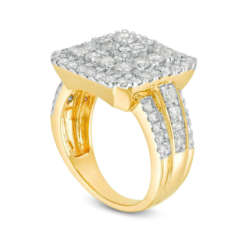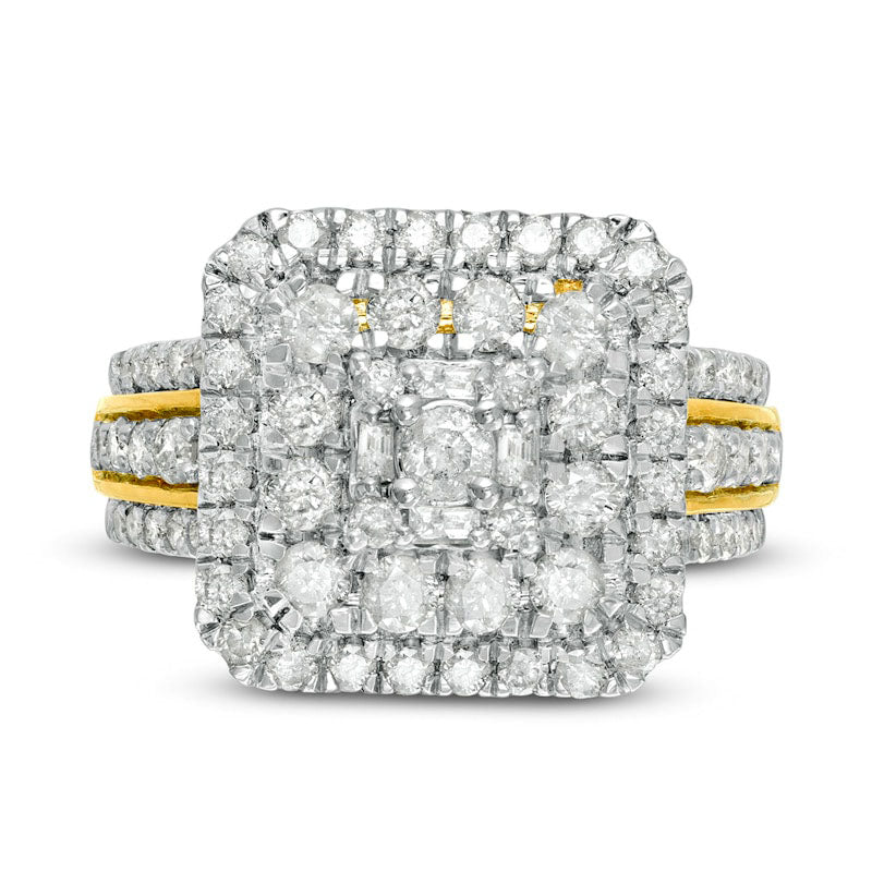 This stunning diamond engagement ring is sure to leave her breathless. Crafted in lovely 10K gold, it boasts a dazzling display of diamonds totaling 2-1/8 cts. t.w. The centerpiece features a cushion-shaped composite with round and baguette-cut diamonds, all enveloped by a double frame of even more diamonds. The triple-row shank is equally spectacular with a center ribbon of graduated-size diamonds and diamond borders that shimmer and shine. This engagement ring is truly incomparable, exuding a brilliant polished shine that is impossible to ignore.