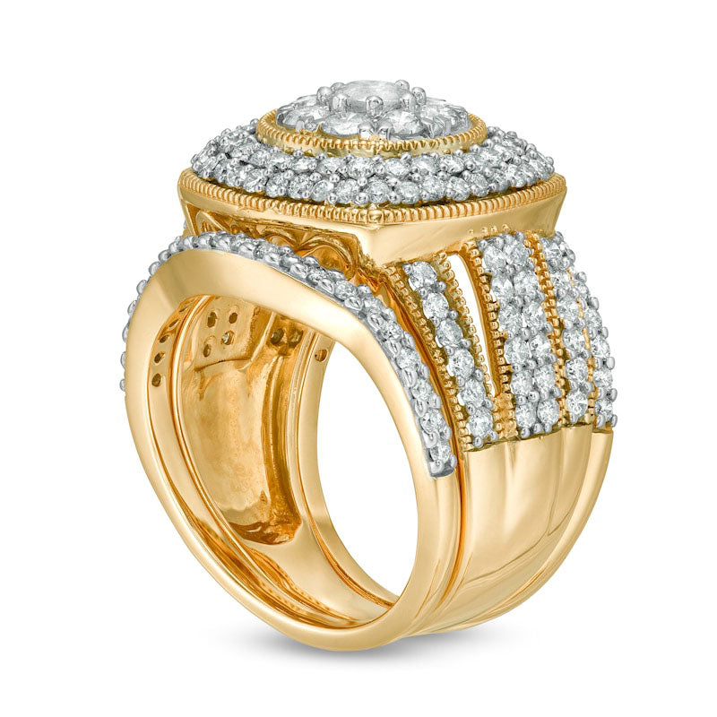 Express your love in bold and romantic style with this vintage-inspired three-piece diamond bridal set. Crafted from exquisite 10K gold, this exceptional set boasts a stunning 1/5 ct. diamond centerpiece surrounded by a diamond composite. The double frame is adorned with intricate milgrain and dazzles with additional diamonds. The split multi-row shank is elegantly detailed with diamonds and milgrain, creating a truly enchanting look. A pair of contoured diamond-lined wedding bands complete the ensemble, making it more than she could ever imagine. With a total of 2-1/4 cts. t.w. of diamonds and an expertly polished finish, this is a bridal set to cherish for a lifetime.