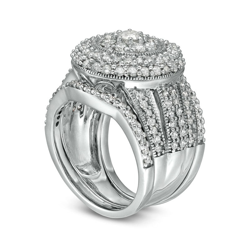 This vintage-inspired three-piece diamond bridal set embodies boldness and romance. It is crafted in luxurious 10K white gold and features a stunning 1/5 ct. diamond at its center in a diamond composite. The shank boasts a split multi-row design adorned with intricate milgrain and additional diamonds. The double frame offers even more sparkle with dazzling diamonds weaving around it. Complimentary to the engagement ring, a pair of matching contoured diamond-lined wedding bands add the finishing touch. This breathtaking bridal set is designed with 2-1/4 cts. t.w. of diamonds and a brilliant polished finish, making it more than she could ever have imagined.