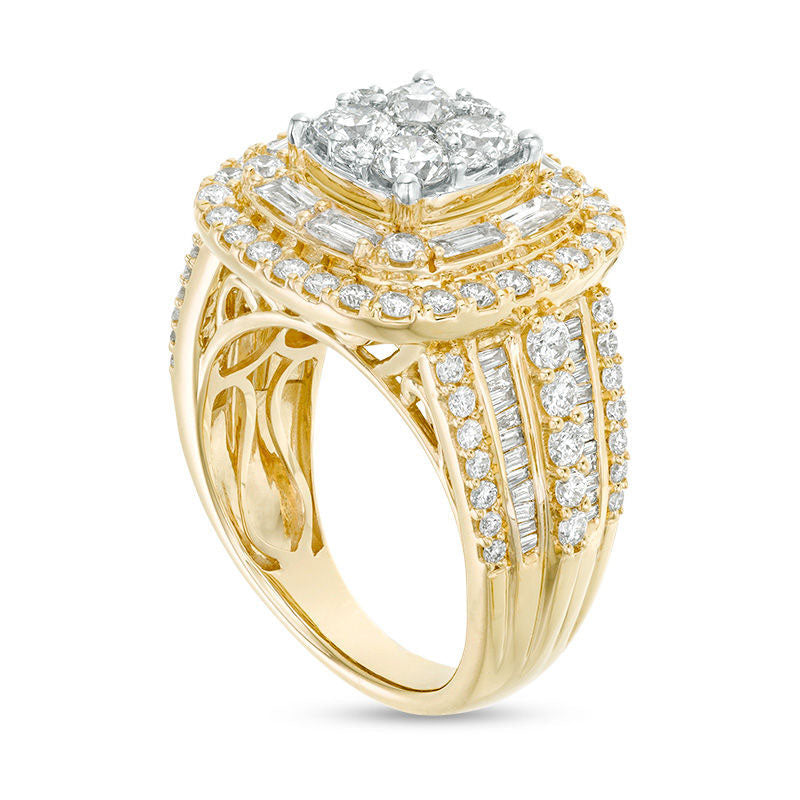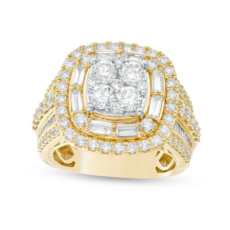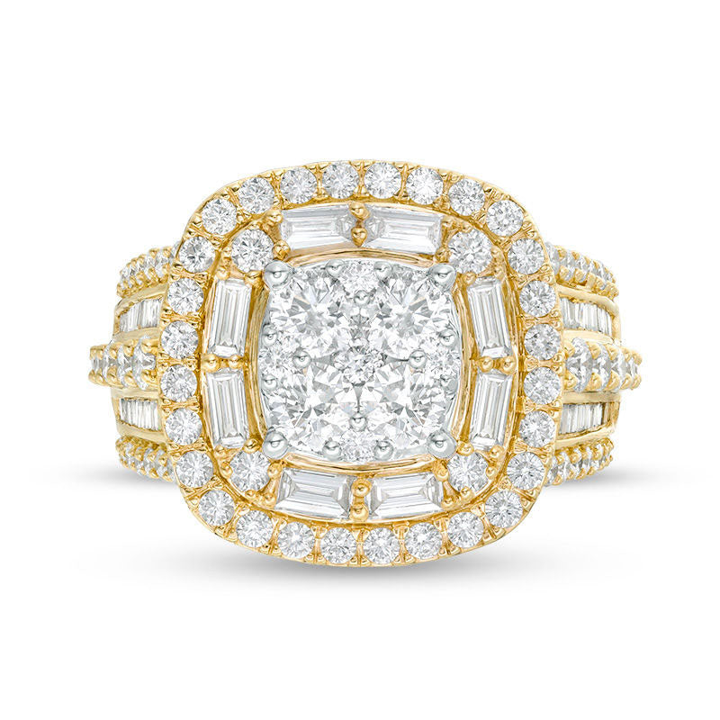 This engagement ring is a true work of art, emanating glamour with every facet. Made with 14K gold, this piece boasts a cushion-shaped composite of dazzling round diamonds, the largest of which are 1/5 ct. each, encircled by a brilliant frame of alternating baguette-cut and round diamonds. A glittering diamond halo completes the picture. The multi-row shank is adorned with ribbons of channel-set baguette-cut diamonds and round diamonds, adding to the striking display. This ring boasts an impressive 2-1/2 cts. t.w. of diamonds, making it a bold choice for any special occasion, and its impeccable mirror-like finish only serves to enhance its undeniable charm. Give your beloved the gift of luxury with this one-of-a-kind engagement ring.