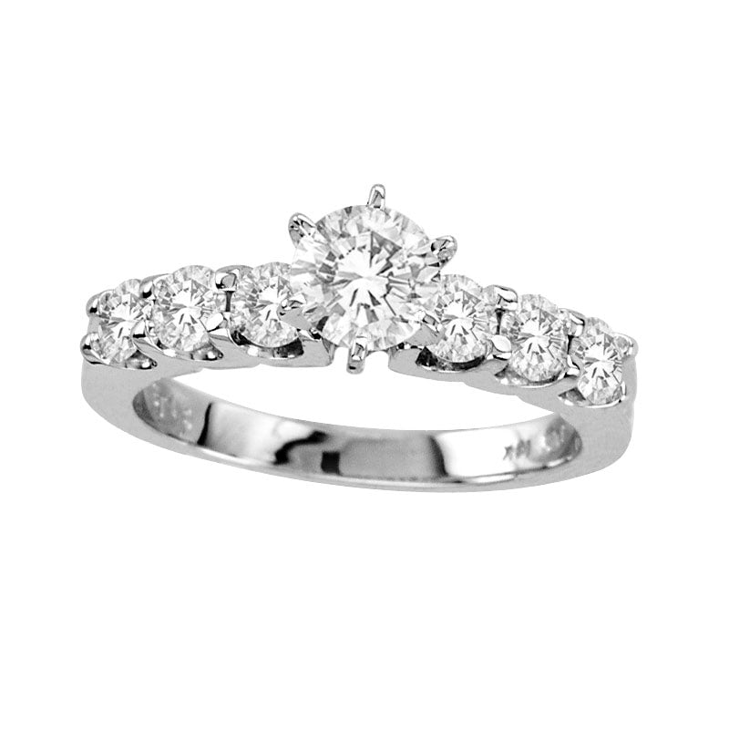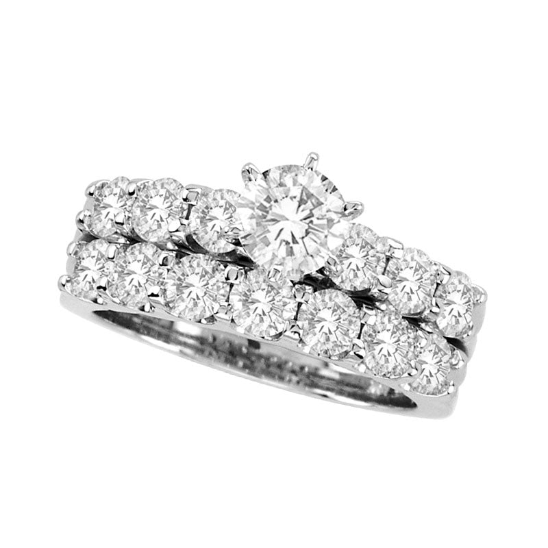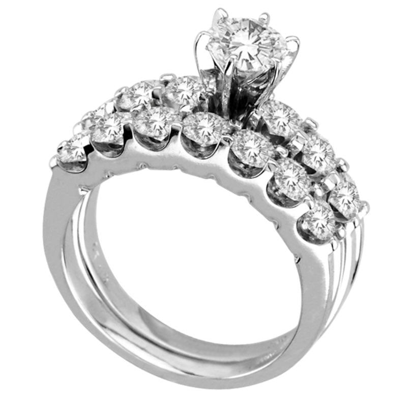 This 14K white gold bridal set sparkles with a breathtaking 2-1/2 CT. T.W. of diamonds. The engagement ring features a lovely 5/8 ct. round diamond center stone in a sturdy six-prong setting, with even more diamonds gracing the shank for a luxurious appearance. The coordinating diamond wedding band sits perfectly beneath the engagement ring, completing the set. This stunning bridal duo will leave her speechless with its bold, bright and exceptional beauty. Its radiant shine is sure to last a lifetime, making it the perfect representation of your lifetime commitment to each other.