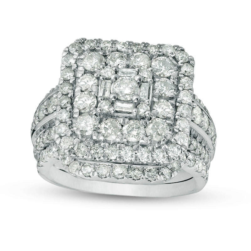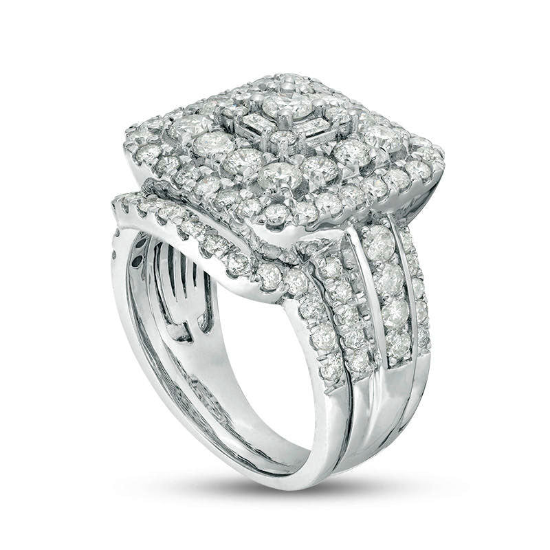 Celebrate your forever love with this captivating 2-1/2 CT. T.W. Diamond Square Frame Multi-Row Bridal Set, crafted in 10K white gold. The engagement ring boasts a breathtaking 1/8 ct. diamond encircled by a square frame of sparkling round and baguette-cut diamonds. Two diamond borders create a mesmerizing focal point, while the shank showcases three multi-row bands separated by polished sculpted gold ribbons. On your special day, a coordinating diamond-lined band fits perfectly with the engagement ring, completing the stunning set. With a total of 2-1/2 cts. t.w. of diamonds and a flawless buffed luster, this bridal set epitomizes the start of a lifetime full of love and happiness.