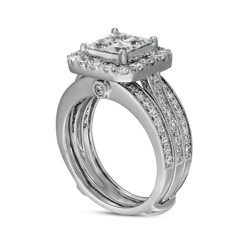 2.5 CT. T.W. Princess-Cut Quad Natural Diamond Frame Antique Vintage-Style Bridal Engagement Ring Set in Solid 14K White Gold
