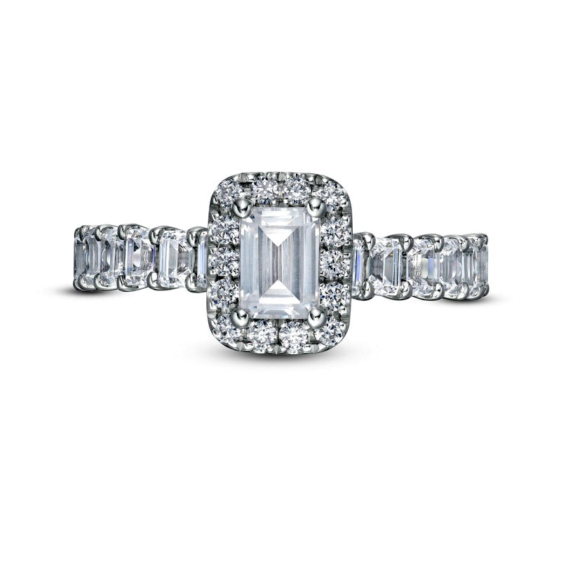 Surprise your beloved with an exceptional token of your affection that will leave her breathless - presented here in the form of an exquisite diamond engagement ring. Created from 14K white gold, this stunning piece showcases a certified 3/4 ct. emerald-cut diamond of remarkable quality, with an impressive color ranking of I and clarity rating of SI2, gracefully enveloped by a frame of shining diamonds. The shank is gracefully adorned with additional 1/10 ct. emerald-cut diamonds that glitter in step with the wearer's movements. Boasting a total of 2 cts. t.w. in diamonds and shining with a spectacular luster, this engagement ring is truly one-of-a-kind. The enclosed certificate, complete with a photo and description of the diamonds, provides assurance of their quality and can also be used for insurance purposes. Show her just how much you care with this exquisite diamond engagement ring.
