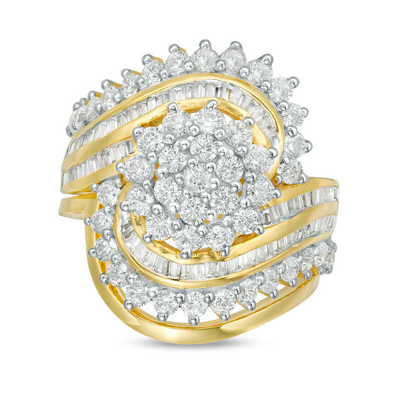 Get ready to sweep your bride-to-be off her feet with this exquisite 2 CT. T.W. diamond bridal set in 10K gold. The engagement ring boasts a stunning flower-shaped composite of diamonds that are surrounded by a sparkling diamond starburst border. Rows of baguette-cut and round diamonds criss-cross the shank, adding even more shimmer to this already dazzling set. Completing the look is a polished, contoured wedding band that perfectly complements the engagement ring. With a total of 2 cts. t.w. of diamonds and a brilliant buffed luster, this wedding set is sure to exceed all expectations.