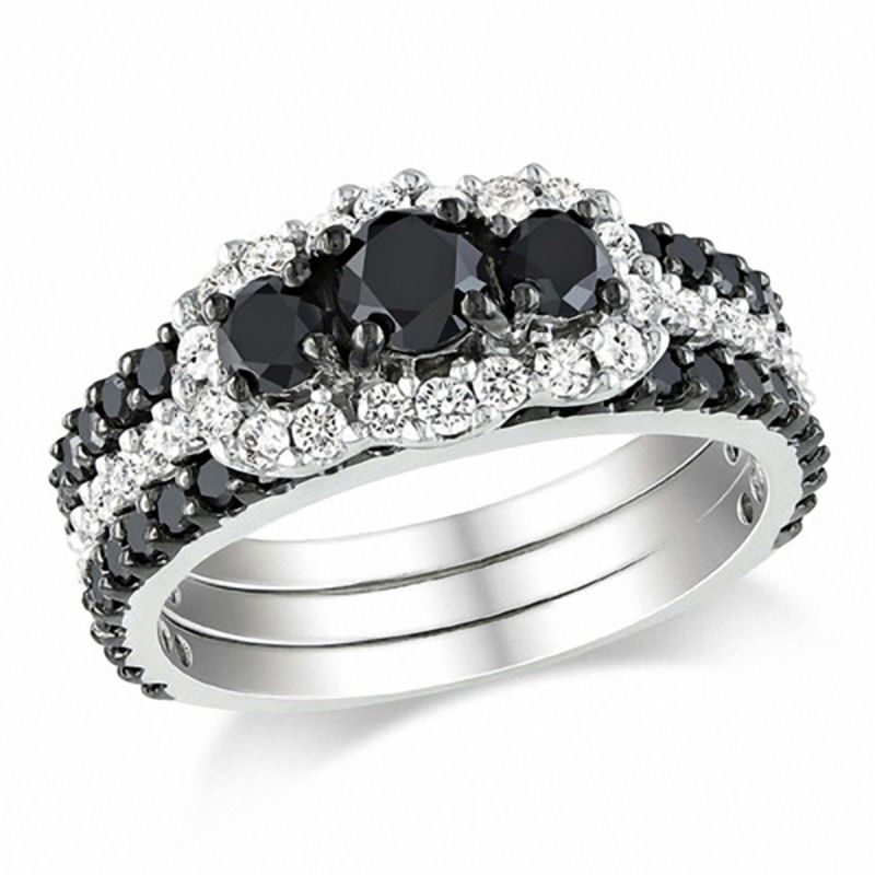 Manufactured in 14K white gold, this bridal engagement ring features three alluring enhanced black diamonds, each framed with shimmering white diamonds and arranged in perfect symmetry across the white diamond-lined shank.