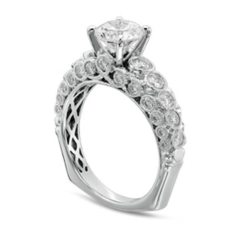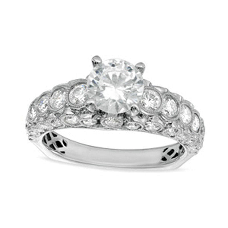 Experience the beauty of a bygone era with this stunning vintage-style diamond engagement ring. Expertly crafted in gleaming 14K white gold, this piece features a breathtaking 1 ct. diamond center stone that exudes sophistication and elegance. Lined with exquisite milgrain details, the dazzling bezel-set diamonds that graduate down the shank and adorn the sides of the band ensure that this ring shimmers from every angle. With a total weight of 2 cts. t.w. and a radiant polished finish, this engagement ring is an everlasting symbol of your love and commitment.