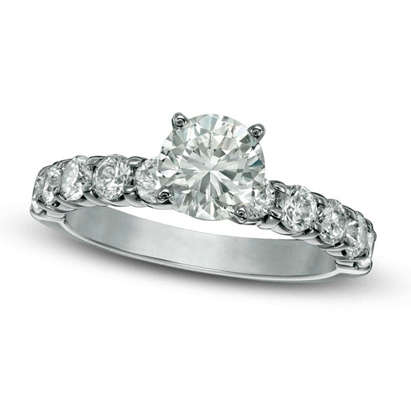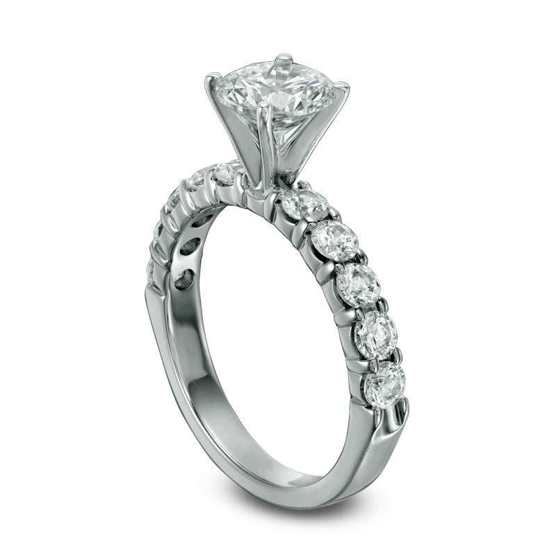Fall in love all over again with this stunning 2 CT. T.W. Diamond Engagement Ring in 14K White Gold. Made to impress, this ring boasts an eye-catching 1 ct. diamond set on a shimmery band adorned with additional smaller diamonds. With a total diamond weight of 2 ct. and a radiant polished finish, this ring is the perfect symbol of your never-ending love. Give a timeless gift that she'll treasure forever with this magnificent engagement ring.