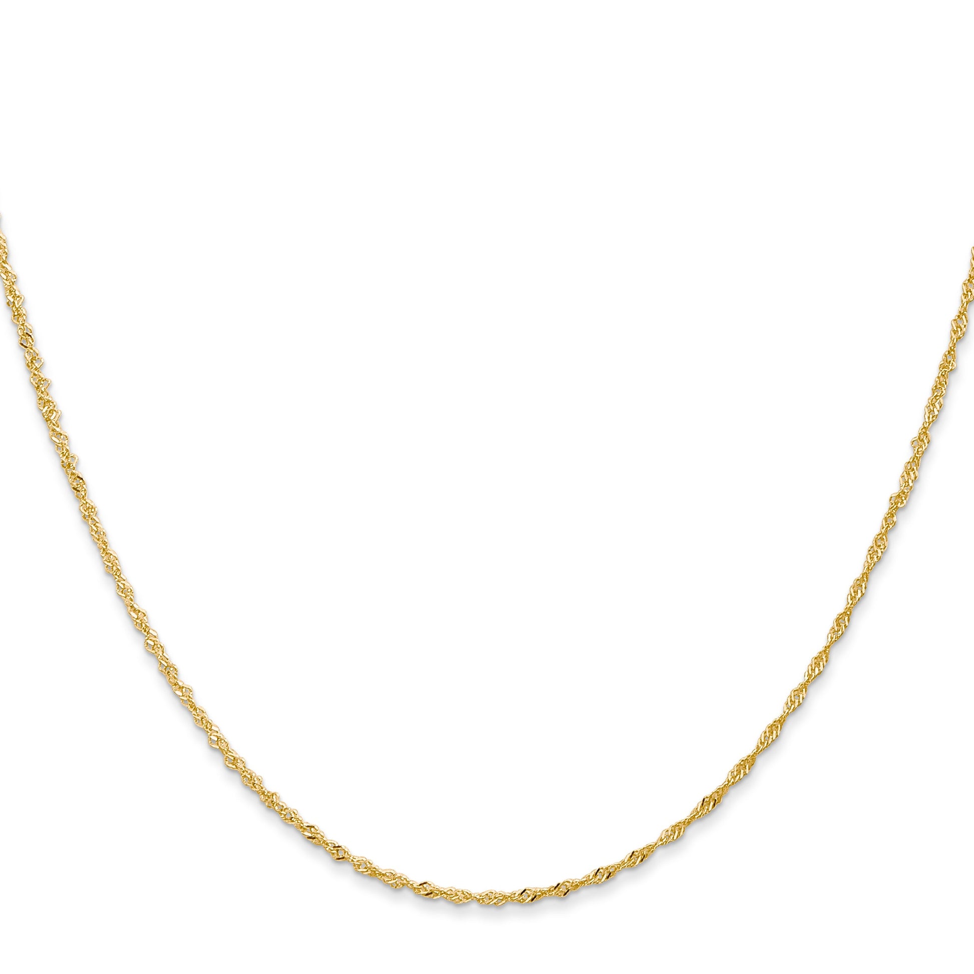 Introducing our exquisite 20 Inch 10K 1mm Singapore Chain, a delicate yet durable piece perfect for elevating any outfit. Crafted from 10K yellow gold, this polished chain gleams with elegance and sophistication. The Singapore design adds a unique twist, making it a standout accessory. Measuring 20 inches in length with a width of 1 mm, it's the ideal size for everyday wear. The spring ring clasp ensures a secure fit, while being nickel-free guarantees comfort for sensitive skin. Invest in timeless beauty with our 20 Inch 10K 1mm Singapore Chain, backed by a lifetime guarantee.