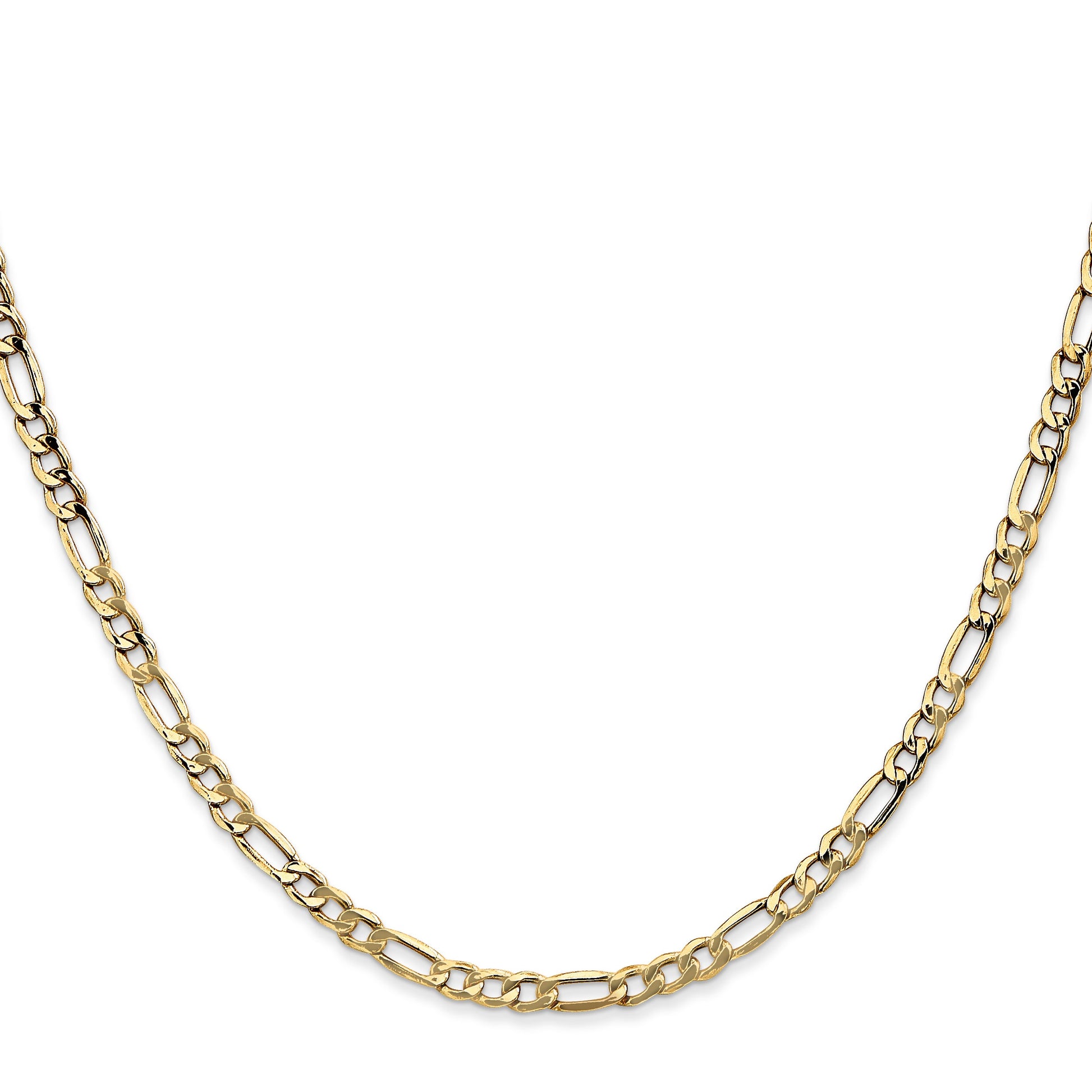 The 20 Inch 10K 3.5mm Semi-Solid Figaro Chain showcases a timeless elegance in yellow gold. This polished chain features a Figaro design with semi-solid links, offering both style and durability. Its 20-inch length and 3.5mm width give it a versatile look suitable for any occasion. The chain is secured with a reliable lobster clasp, ensuring it stays in place all day. Crafted from 10K gold, this necklace also comes with a lifetime guarantee, promising long-lasting quality. Wear the 20 Inch 10K 3.5mm Semi-Solid Figaro Chain for a touch of classic sophistication.