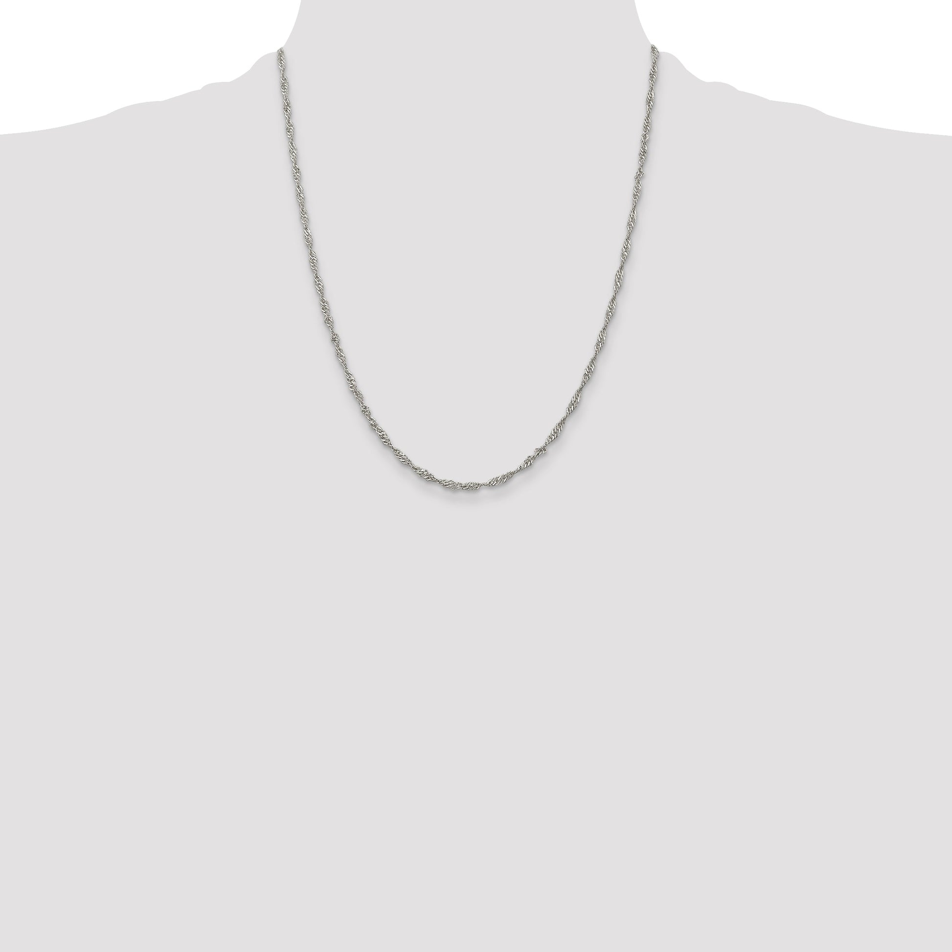Introducing the 22 Inch Sterling Silver 2.25mm Singapore Chain, a timeless piece crafted for elegance and style. Made from 925 sterling silver, this beautiful necklace offers a polished finish that shines brilliantly. Measuring 22 inches long, it forms an exquisite Singapore link chain, known for its unique twisted design that catches the light perfectly. The chain is 2.25 mm wide, offering a fine balance of subtlety and presence. It is secured with a sturdy lobster clasp, ensuring it remains in place all day. The 22 Inch Sterling Silver 2.25mm Singapore Chain is the perfect blend of style and sophistication for any occasion.
