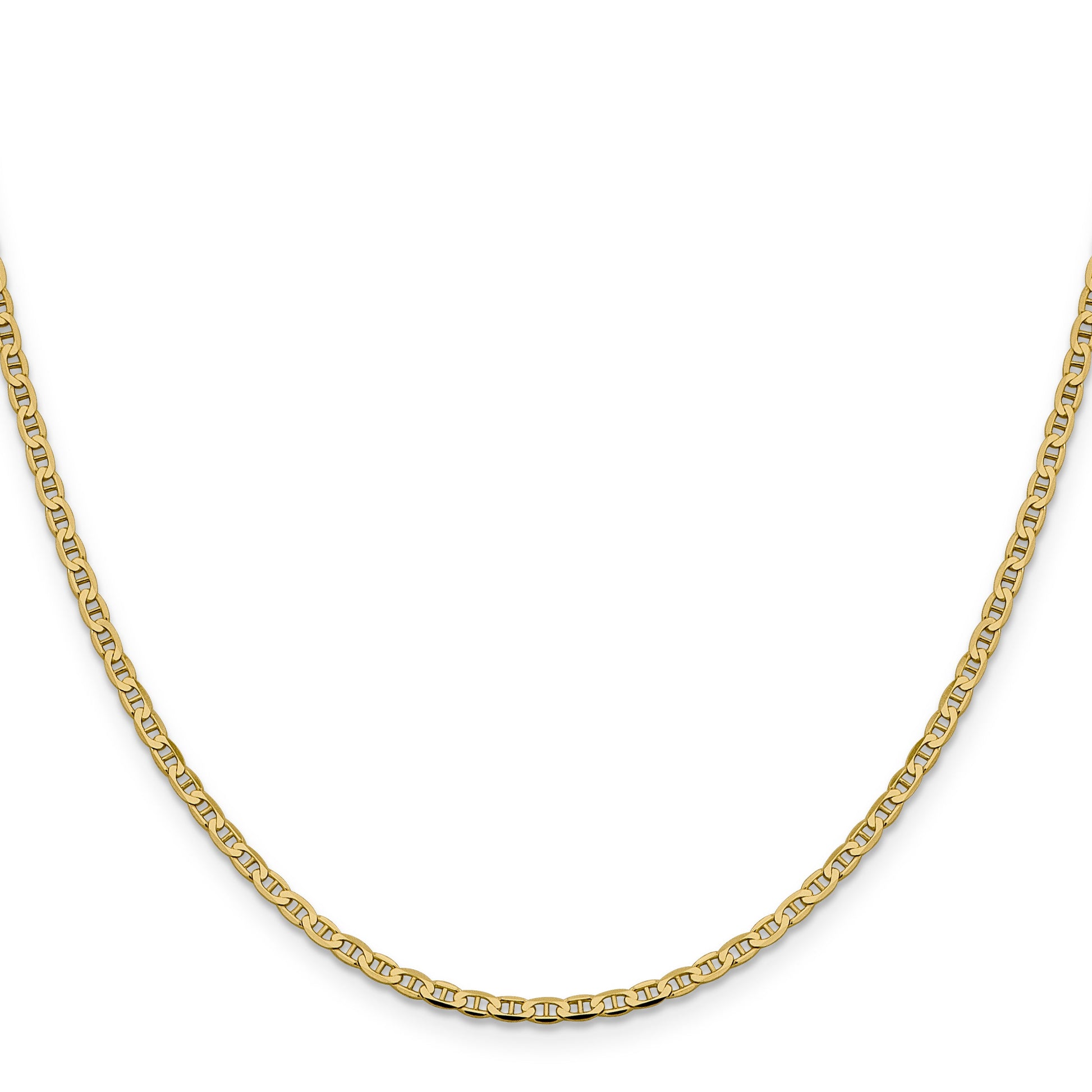 Introducing the 24 Inch 10K 2.4mm Flat Anchor Chain. This stunning piece shines in polished 10K yellow gold, making it a classic addition to any outfit. The chain, spanning 24 inches in length and measuring 2.4mm in width, offers a solid anchor design that exudes strength and elegance. Its machine-made craftsmanship ensures lasting quality, while the lobster clasp provides secure wear. Ideal for both everyday use and special occasions, the 24 Inch 10K 2.4mm Flat Anchor Chain is a timeless accessory that enhances your jewelry collection.